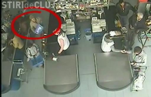 Bătrânica, filmată în parcarea unui supermarket Unicarm din Gherla după ce a furat un portofel cu 1.500 de lei, s-a speriat și a returnat banii.