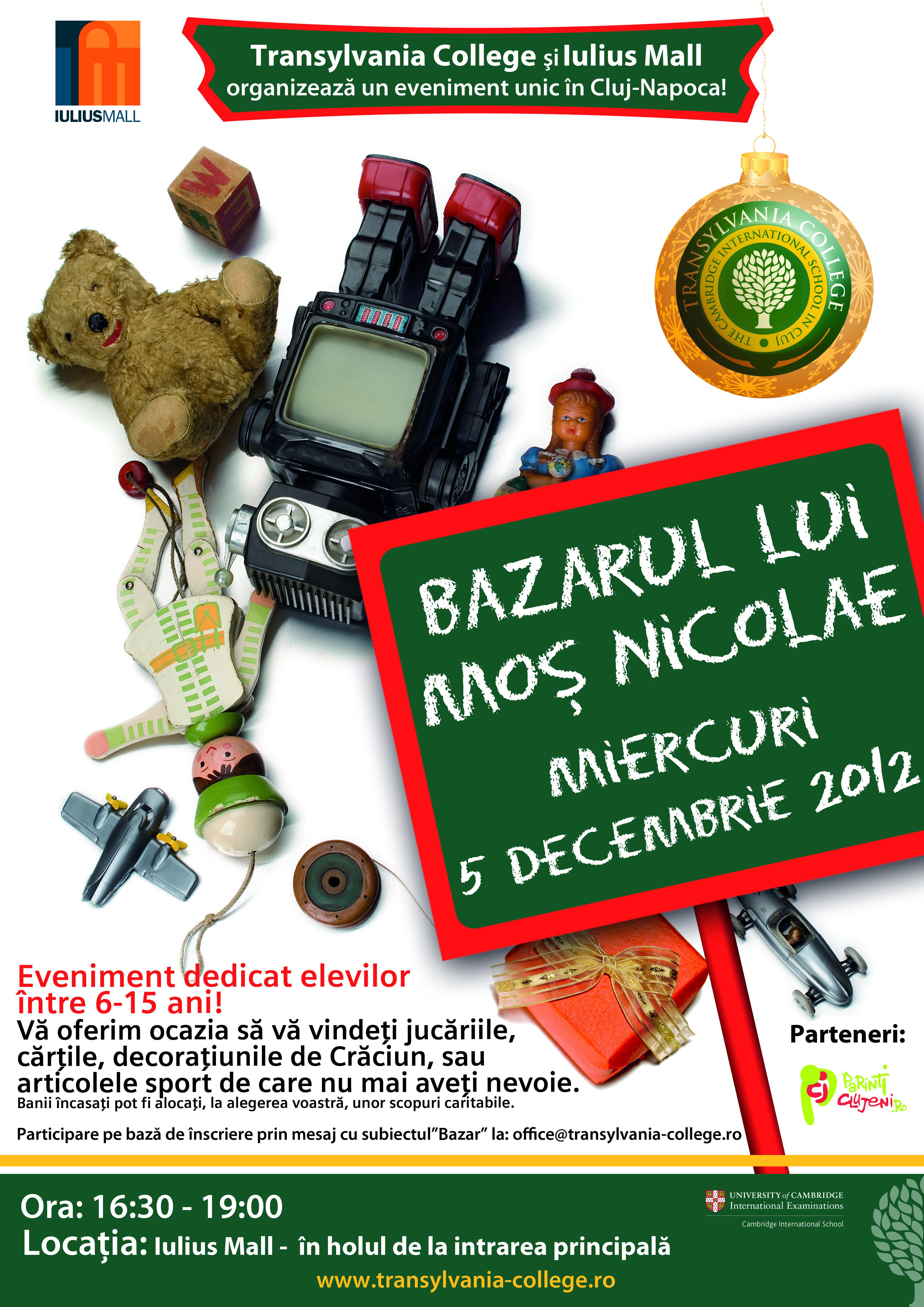 Transylvania College, în parteneriat cu Iulius Mall Cluj, îi invită pe clujeni la ”Bazarul lui Moș Nicolae”, care va avea loc miercuri, 5 decembrie, între orele 16:30-19:00, în holul de la intrarea principalǎ din centrul comercial.