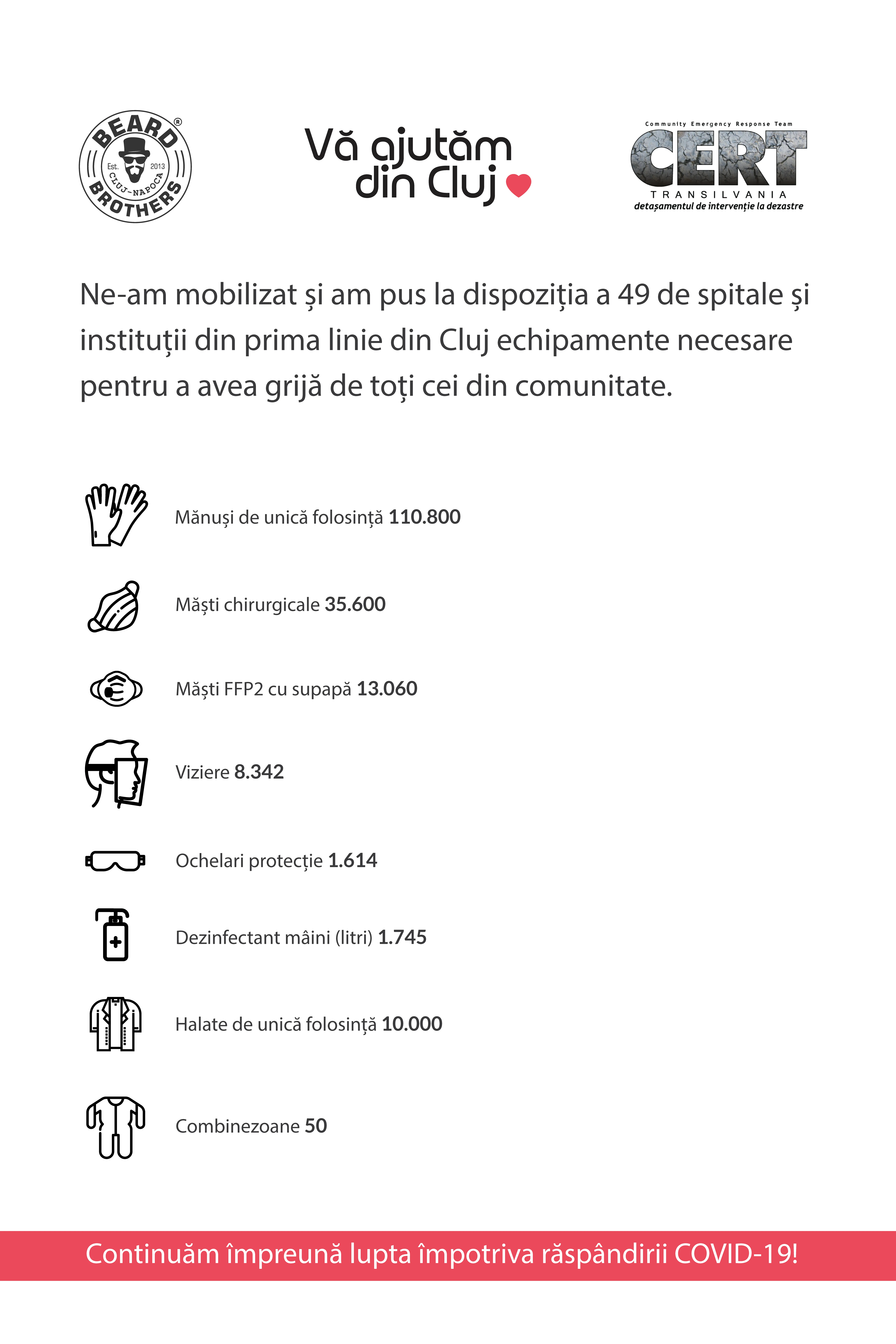 Beard Brothers, Vă ajutăm din Cluj și CERT Transilvania s-au mobilizat și împreună au pus la dispoziția a 49 de spitale și instituții din prima linie din Cluj echipamente necesare pentru a avea grijă de toți cei din comunitate.