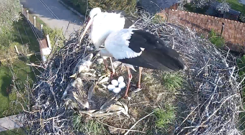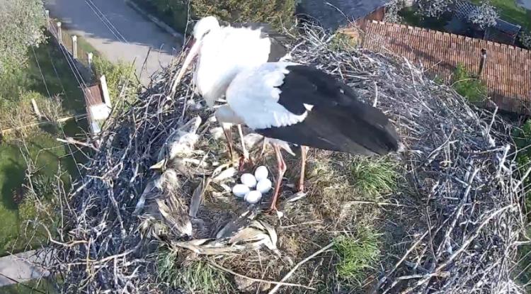 În cuibul de berze de la Vlaha au fost deja depuse cinci ouă, așa cum s-a întâmplat și anul trecut.