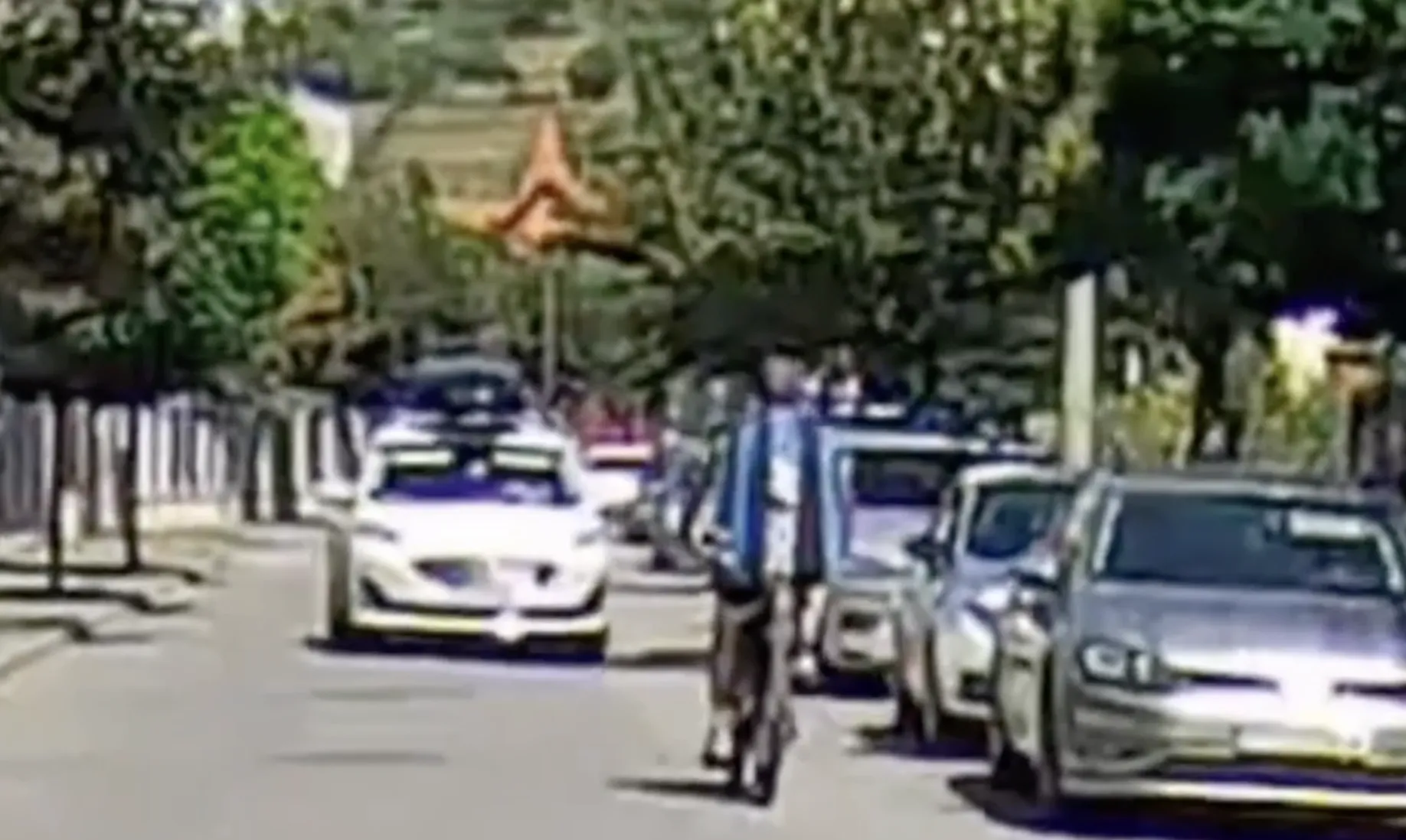 În imagini se vede cum un biciclist circulă pe carosabil și depășește o mașină aflată în mers. După ce trece de autoturismul celui care filmează scena, biciclistul își continuă traseul fără să își modifice direcția, deși din față venea o altă mașină.