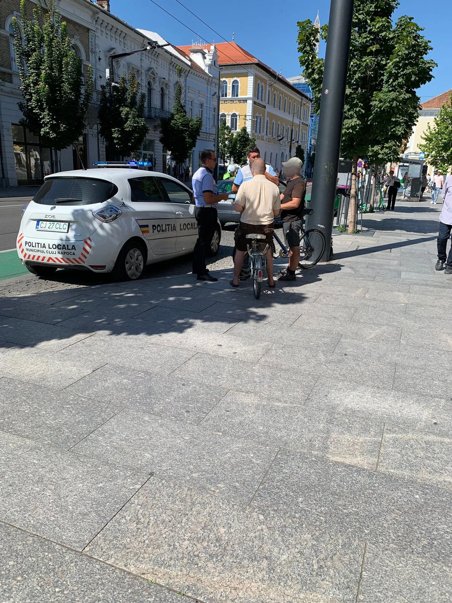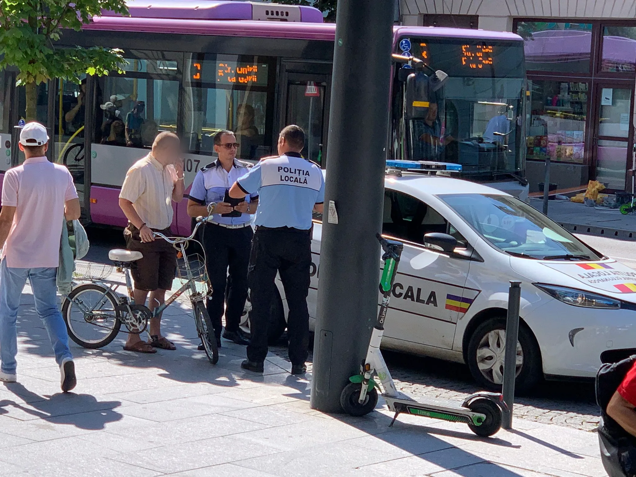 Doi bicicliști au fost văzuți în fața magazinului Central, pe strada Regele Ferdinand, un punct foarte aglomerat, și amendați pentru că circulau pe trotuar.