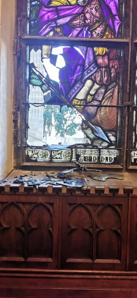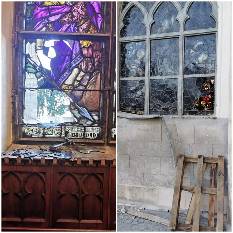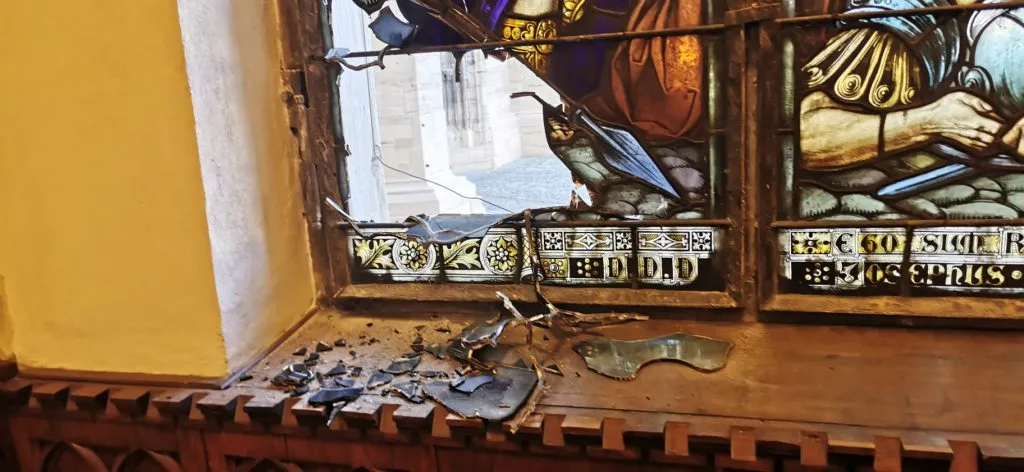 După ce una dintre cutii a fost furată ieri de un hoț, frumoasele vitralii ale Bisericii monument au fost sparte cu o tijă de fier în speranța că vor putea continua să jefuiască.