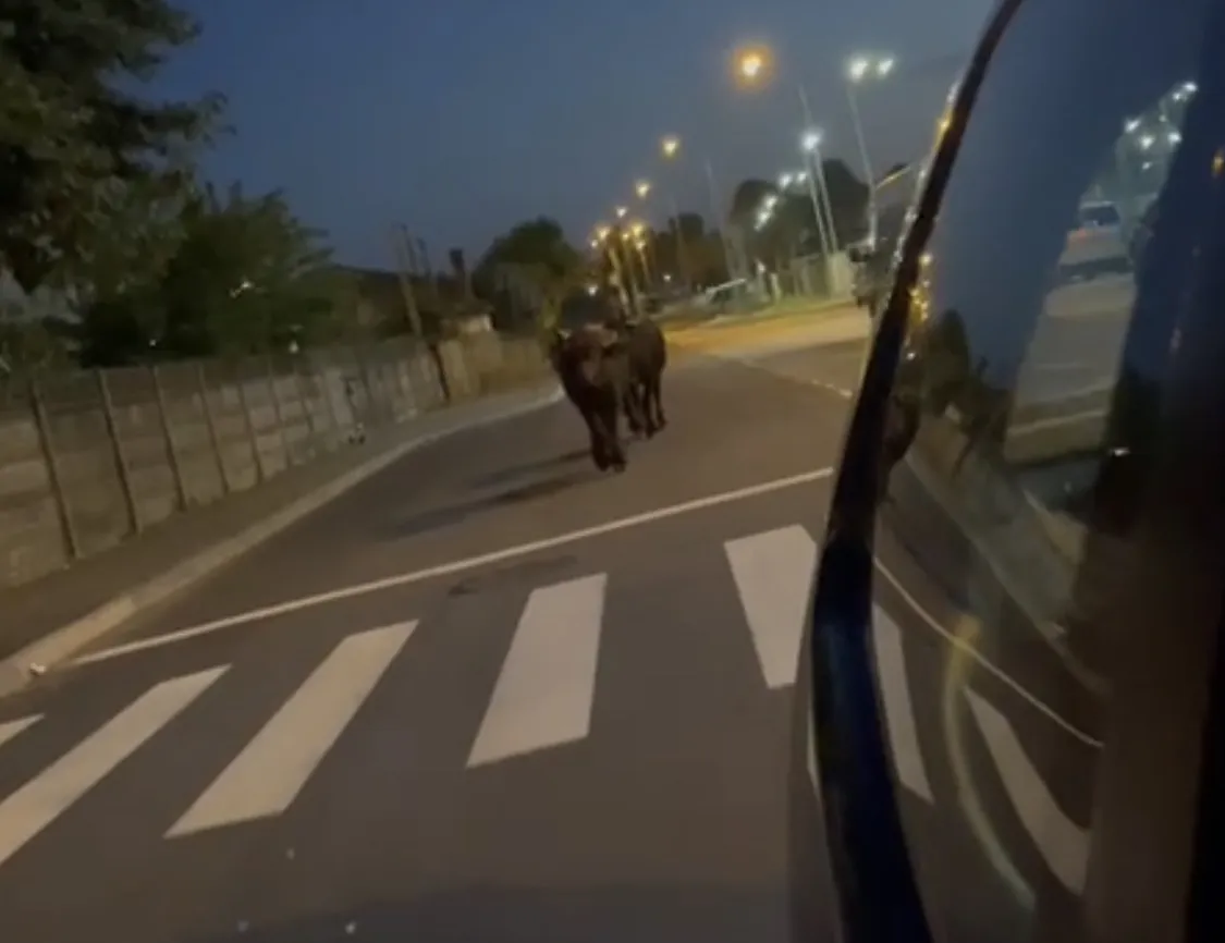 Doi bivoli au fost filmați luni seara, in jurul orei 22.30, in fata Dedeman Cluj, in timp ce se plimbau in trafic, spre strada Oașului.