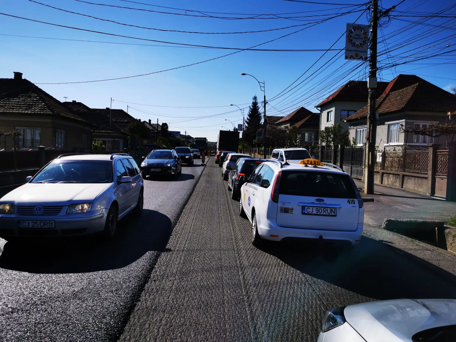 Traficul în comuna Baciu este blocat, circulându-se bară la bară, din cauza unor lucrări de asfaltare.