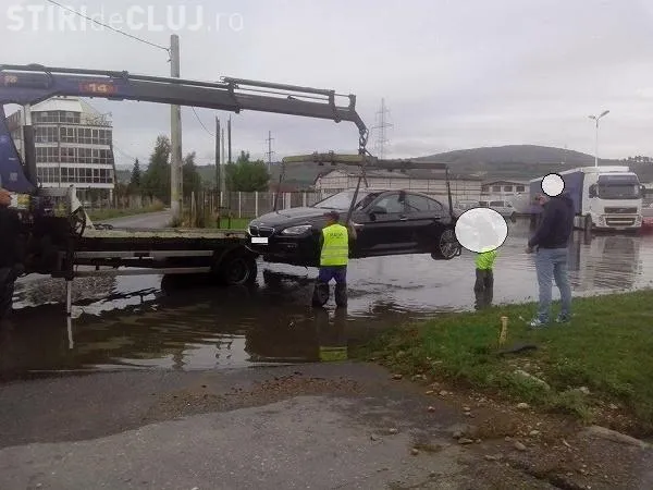 Un BMW a fost scos cu macaraua dintr-un lac format după ce s-a înfundat canalizarea comunală.