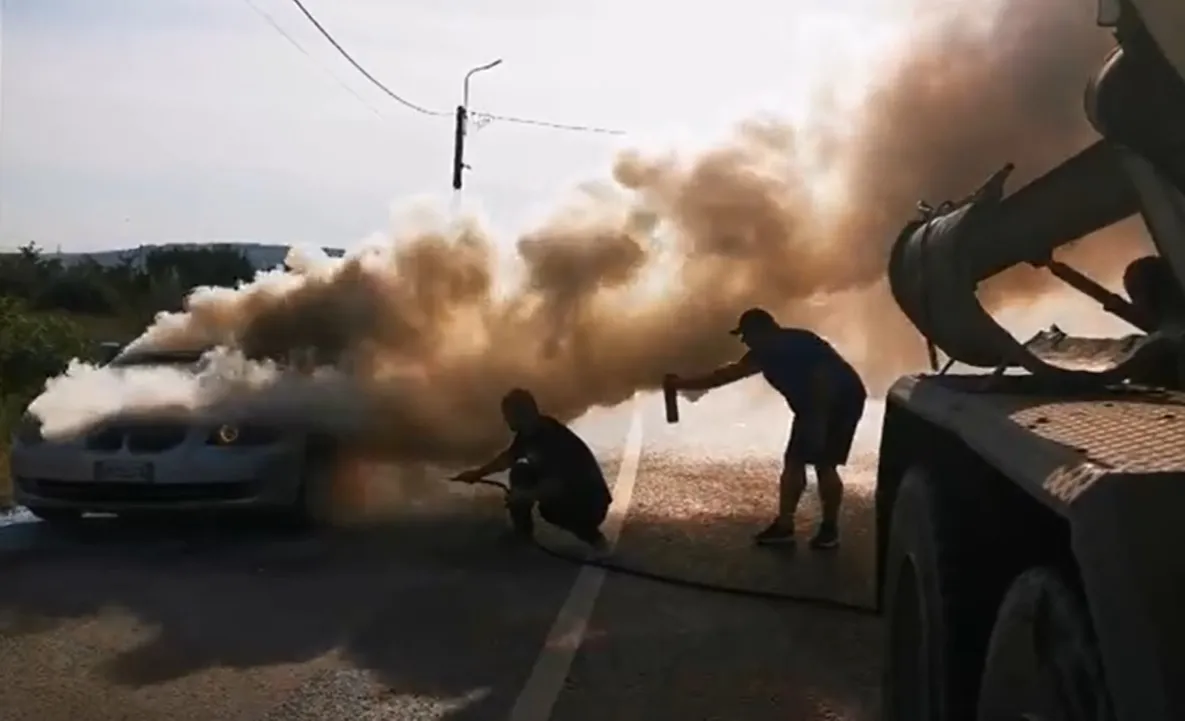 BMW în flăcări la ieșire din Florești! Participanții la trafic au dat dovadă de spirit civic FOTO
