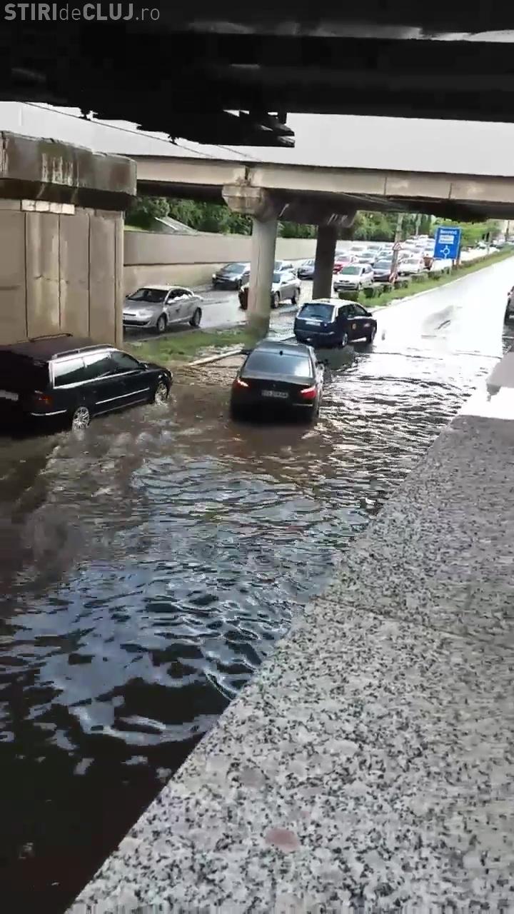 Șoferul a calculat greșit adâncimea apei și a crezut că poate trece pe lacul format sub pod, dar realitatea i-a jucat o festă urâtă. Apa a intrat la motor și mașina a rămas blocată.