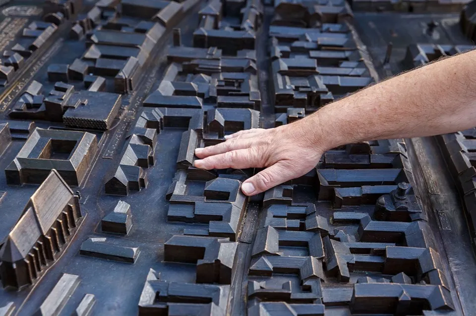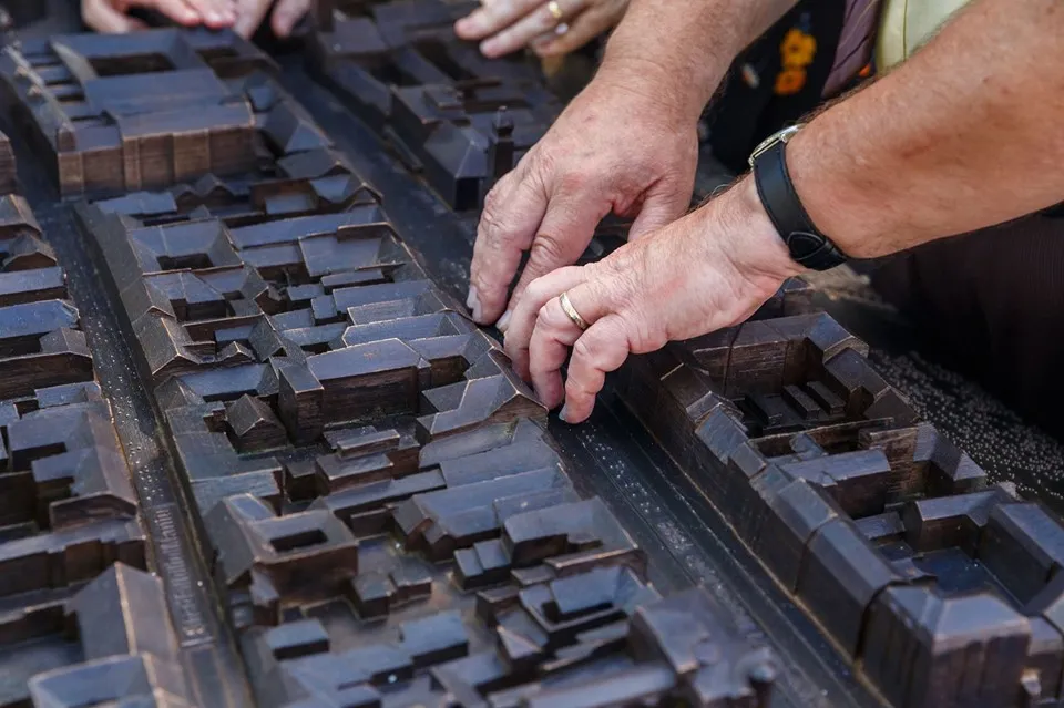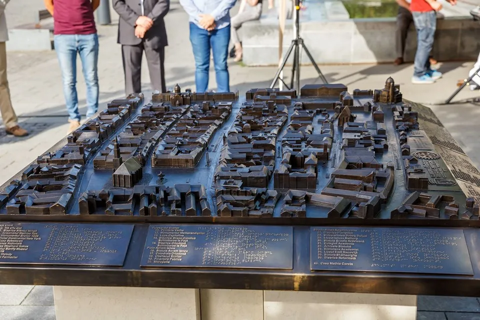 Macheta este amplasată pe colțul sud-vestic al Pieței Unirii și este inscripționată în limbajul Braille, fiind accesibilă pentru persoanele cu deficiențe de vedere. Acestea pot palpa reprezentările clădirilor și pot astfel să "simtă" centrul orașului.