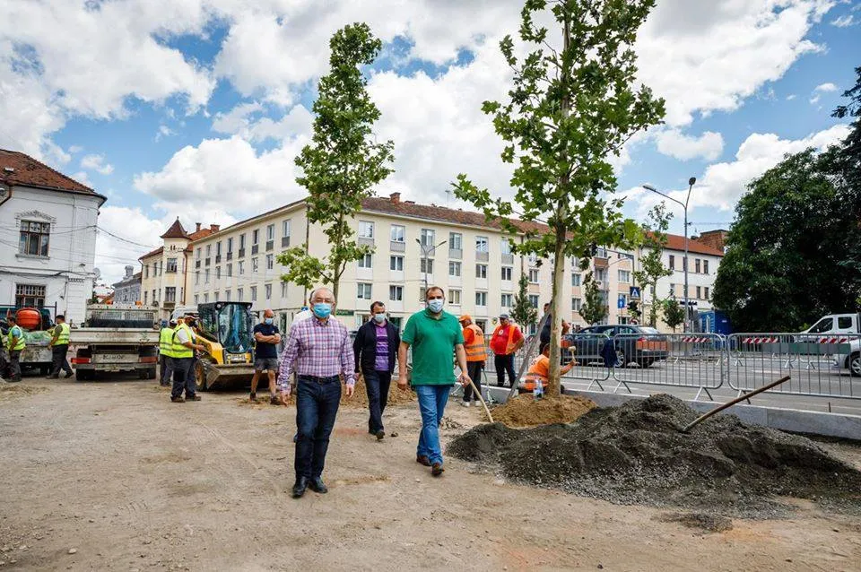 Primarul Emil Boc s-a fotografiat în Piața Lucian Blaga, fosta Piața Păcii, cum planta copaci, care apoi au fost scoși pentru a se continua șantierul.