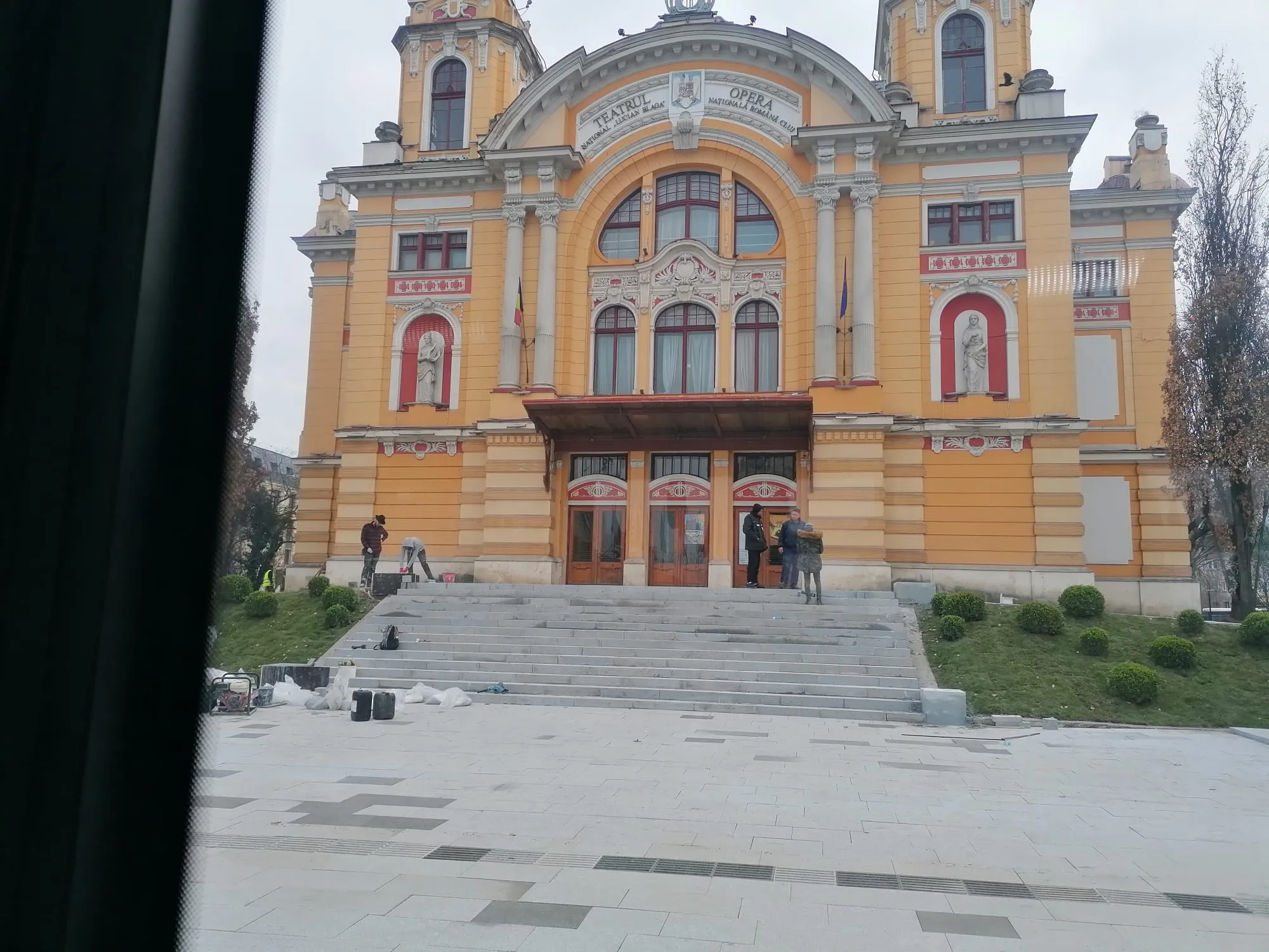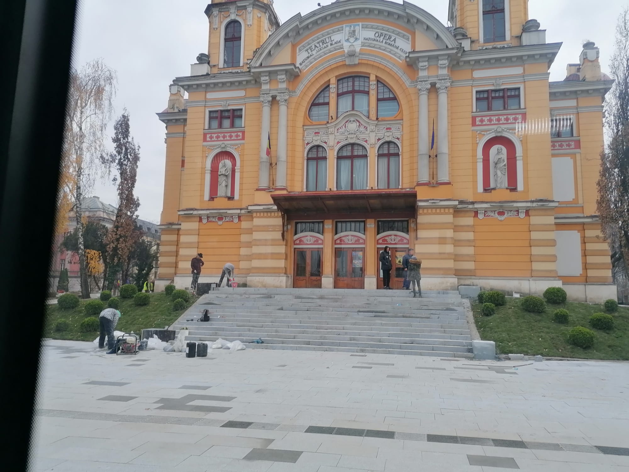 Esplanada din fața Teatrului Național Cluj este aproape terminată, muncitorii fiind zoriți chiar de Emil Boc să termine de turnat beton și de montat granitul.