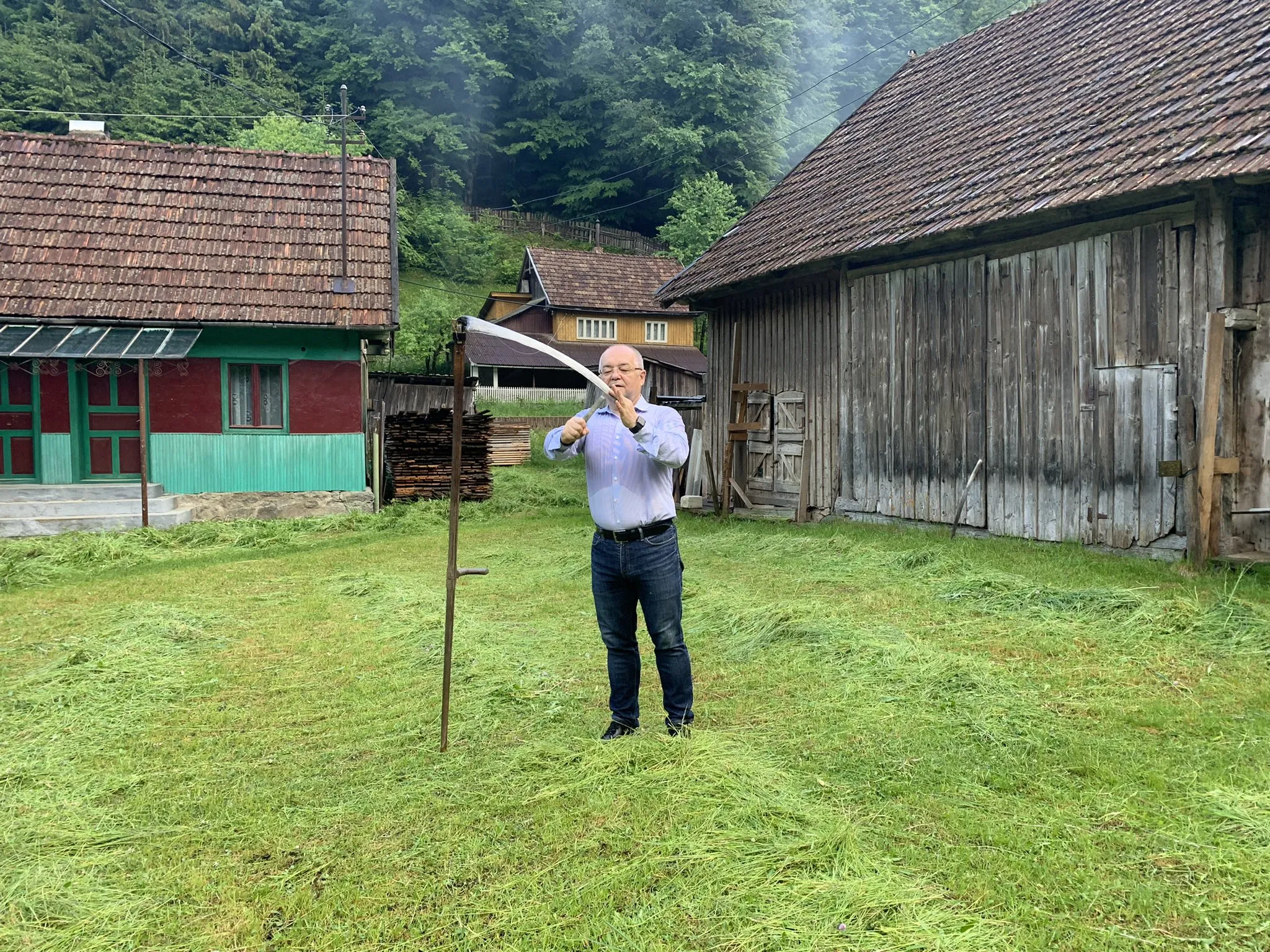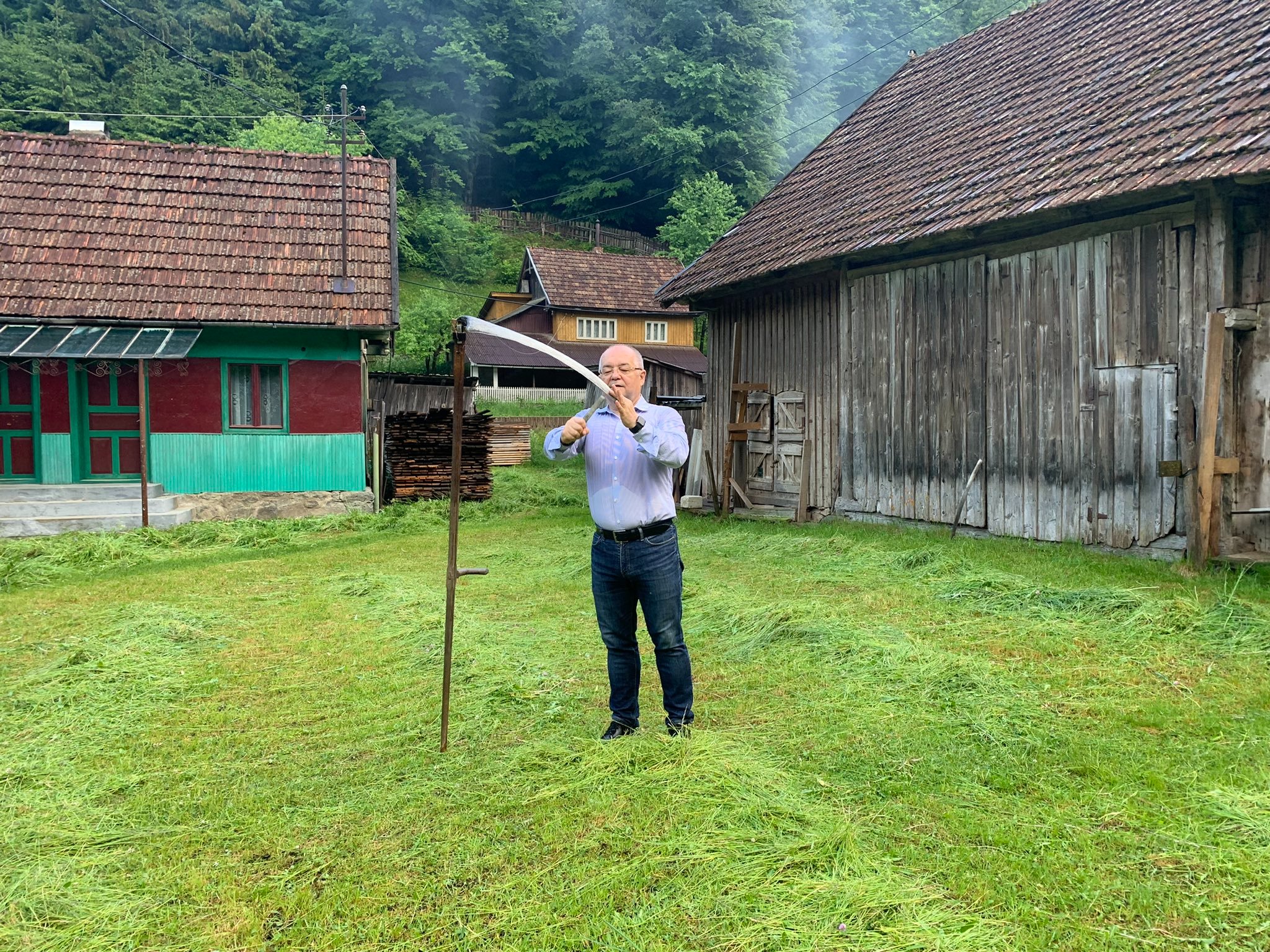 Boc s-a filmat cum a ascuțit coasa în curtea casei natale din Răchițele - VIDEO