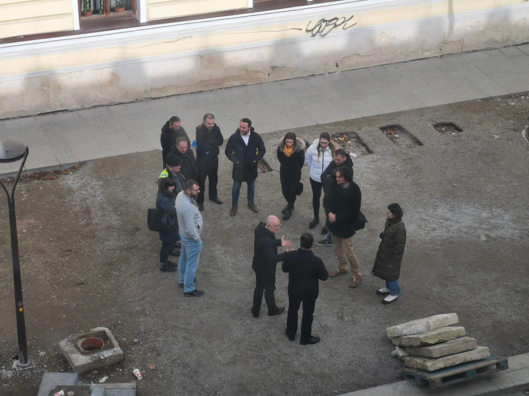 Foto: Emil Boc, conducând lucrările de pe strada Kogălniceanu, în timp ce ”specialiștii” îl ascultă. Ulterior, dacă îl întrebi spune că el nu are nicio decizie și că ”specialiștii” hotărăsc totul