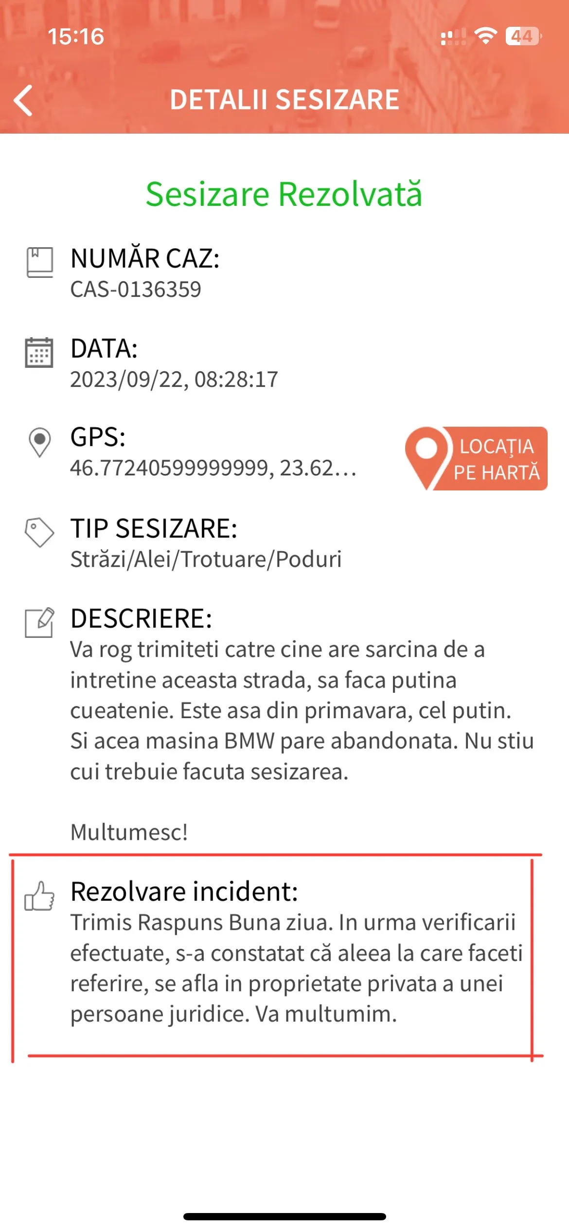 Acesta a sesizat în 22 septembrie că e mizerie și sunt mașini abandonate, iar răspunsul îl vedeți mai jos.