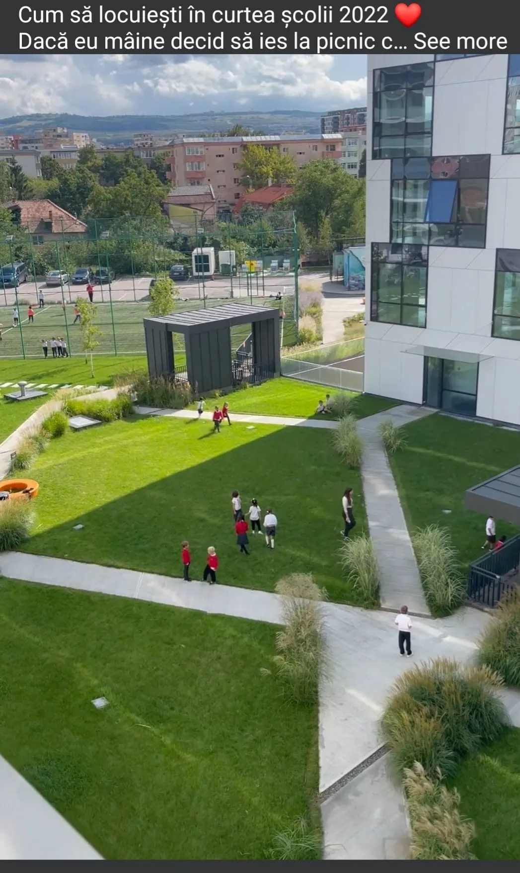 Școala a fost amplasată într-un ansamblu modern, unde sunt și birouri și locuințe. Locatarii spun că zona s-a transformat în curtea școlii.