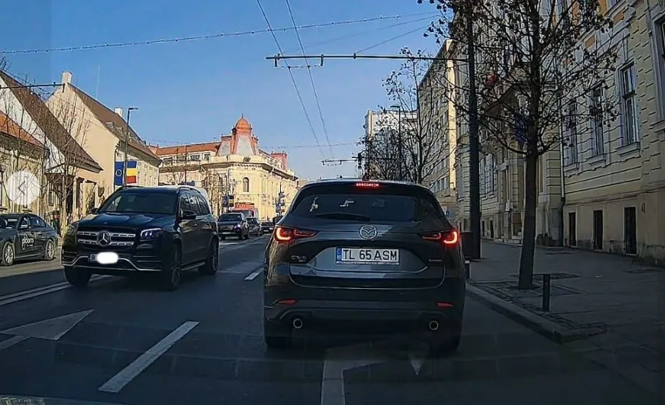 Bolid de lux Mercedes, cu numere de București, filmat pe contrasens chiar în fața Primăriei Cluj-Napoca. Are o vină și trasarea benzilor? VIDEO