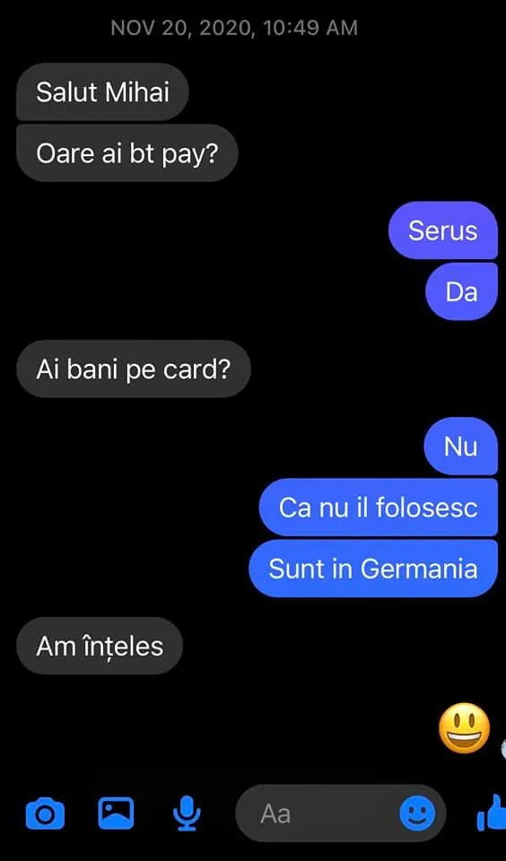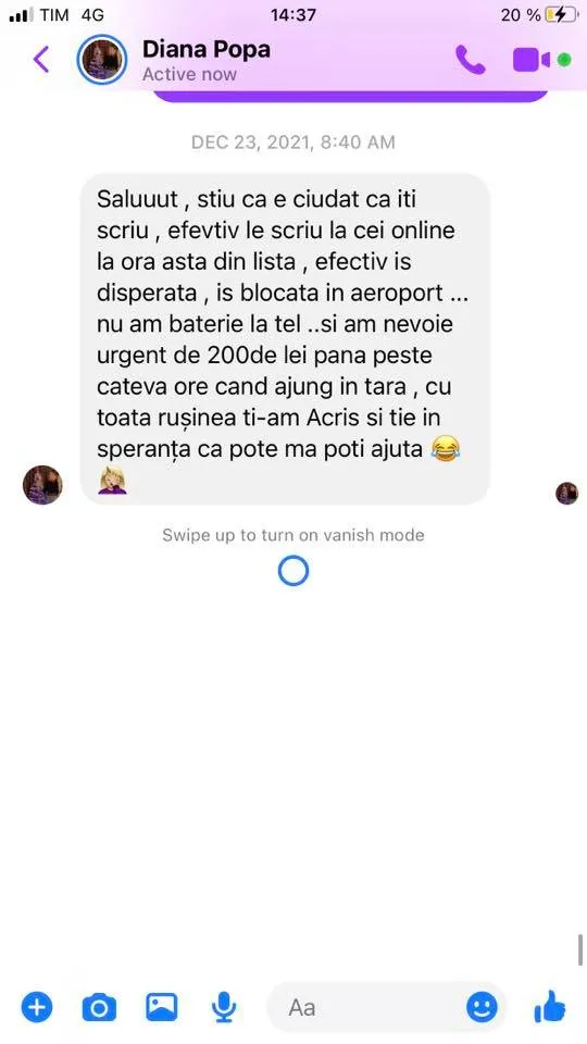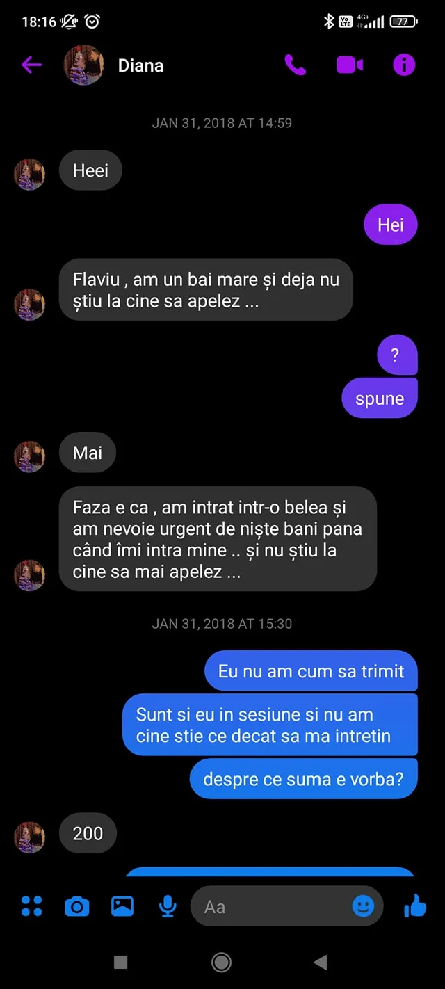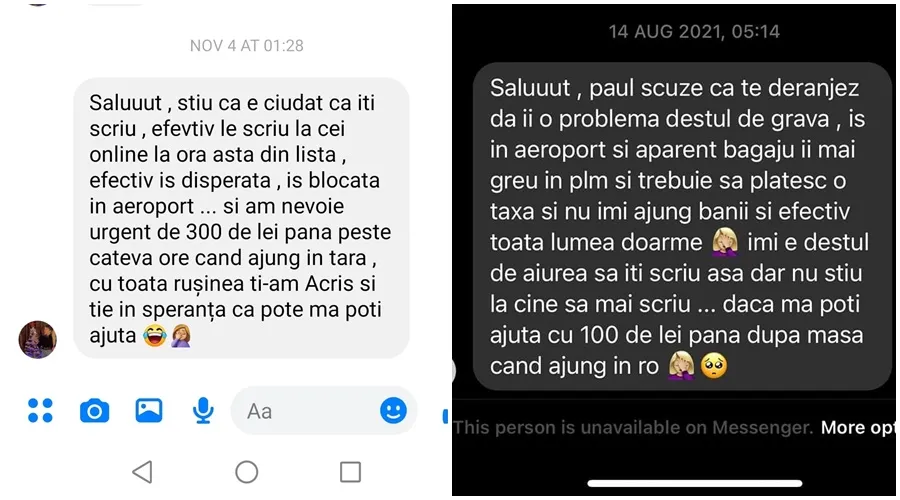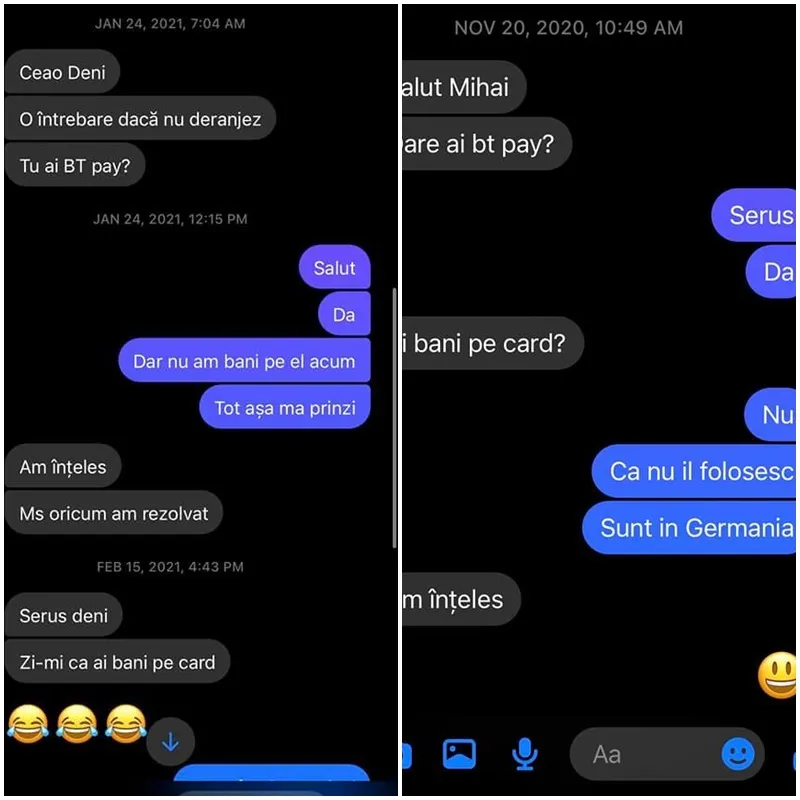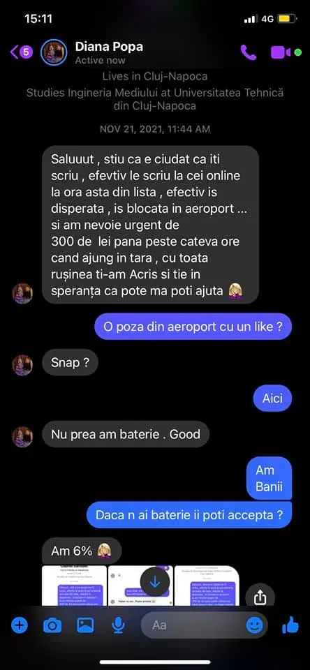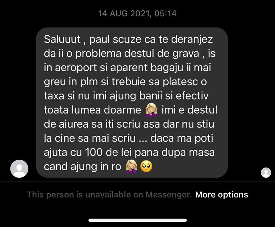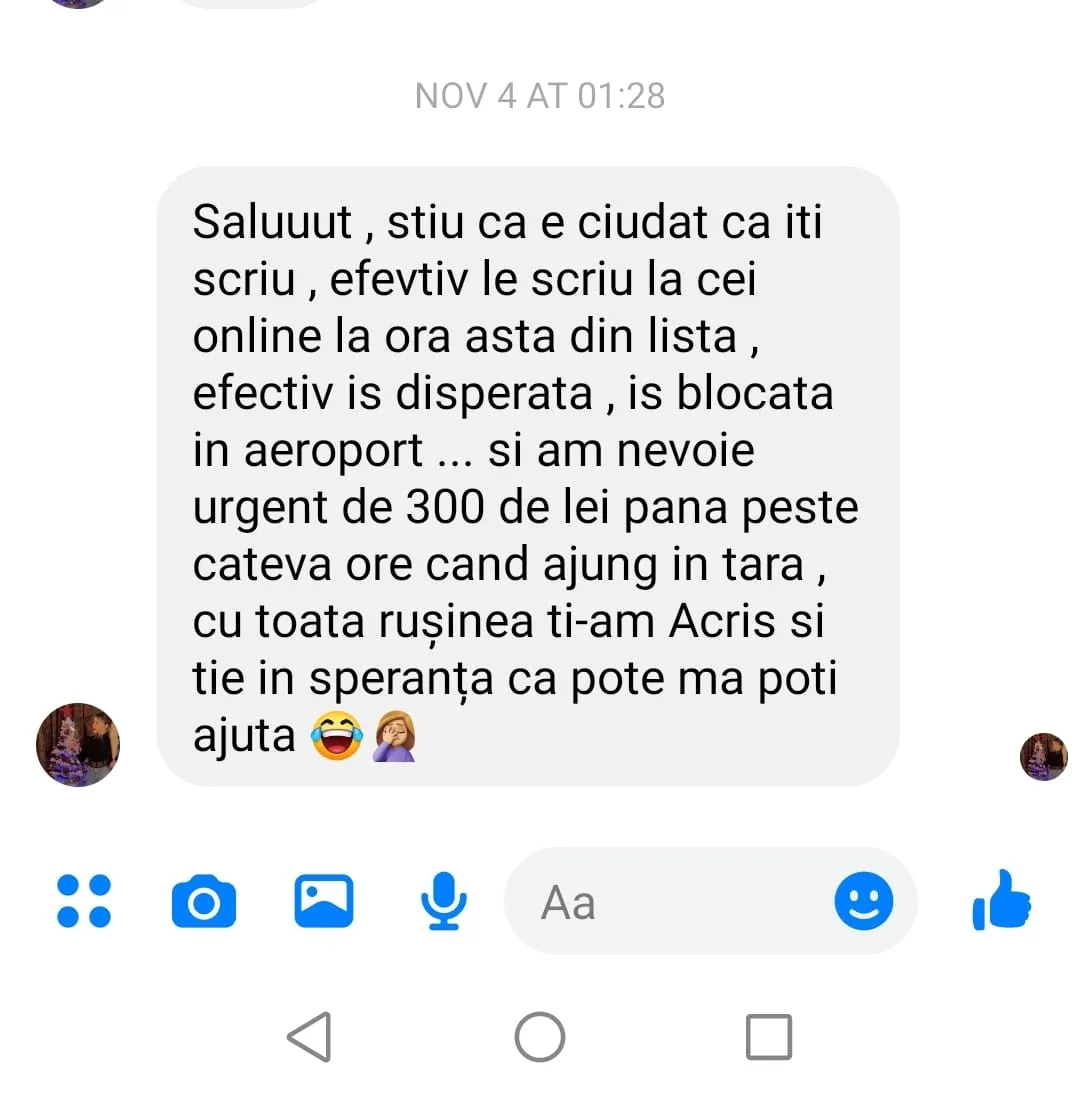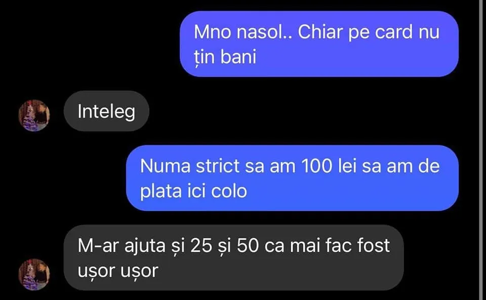 ”Aveți mare grija la ea!! Tepara, escroaca!! La ora 5 dimineața, îmi trimite mesaj dacă pot sa o ajut cu suma de 200 lei deoarece este în aeroport și trebuie sa ajungă in tara pentru inmormantarea bunicii ei,ea rămânând fără bani. I-am trimis 240 lei, ultimii mei bani, promitand ca îi va transfera înapoi de îndată ce ajunge în țară, apoi a spus ca nu s-au virat banii, ca ea nu a primit nimic. Transferul a fost făcut, am umblat și pe la banca cu extrase de cont, iar banii au fost virati către ea, așadar este o escroaca. 200 lei de pe unul 200 de pe altul, la 10 persoane are 2000 pe zi. Sper ca nu a mai picat nimeni în plasa, iar cu ocazia asta o fac faimoasa, sa o cunoască toata lumea, ce fel de fata buna e. Rușine sa îi fie și de educația pe care a primit-o de la părinți. Așa sa ii ajute Dumnezeu. Aveți grija oameni buni cu astfel de specimene!!!”, a relatat Mihai, pe un grup din Turda.
