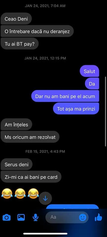 ”Și eu mi-am luat țeapă de 300 lei, dar na, invațătură de minte. Totusi sper sa nu mai ia si altii. Da! Am crezut ca sunt singurul ce o luat țeapă. Nici nu mi-am batut capu sincer, banii respectivi nu se mai recupereaza.