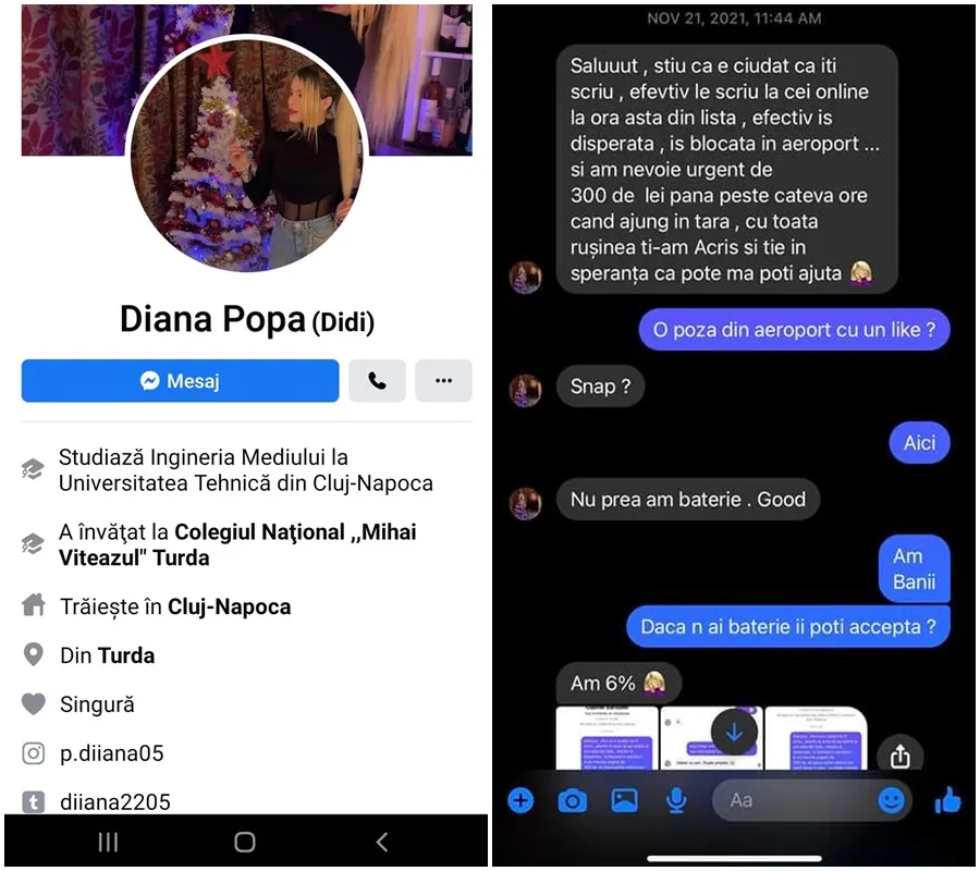 În 9 februarie, un turdean înșelat a demascat cazul și l-a prezentat public pe un grup din Turda. Diana operează foarte simplu. Scrie tuturor persoanelor de pe Facebook, în special bărbaților, și le cere să o ajute cu bani pentru că este blocată în Aeroport, și nu are bani pentru diverse marunțișuri, cum ar fi bagajul. Pe Mihai, din Turda l-a prostit de 200 de lei. După ce a luat banii nu i-a mai scris.