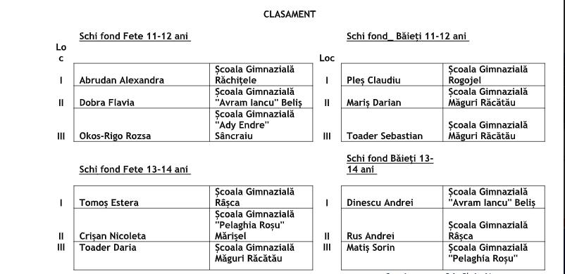 În concurs au participat nu mai puțin de 162 de elevi de la cele 7 centre de schi din județ printre care: Școala Gimnazială Răchițele, Școala Gimnazială „Avram Iancu” Beliș, Școala Gimnazială „Ady Endre” Sâncraiu și Școala Gimnazială Râșca.