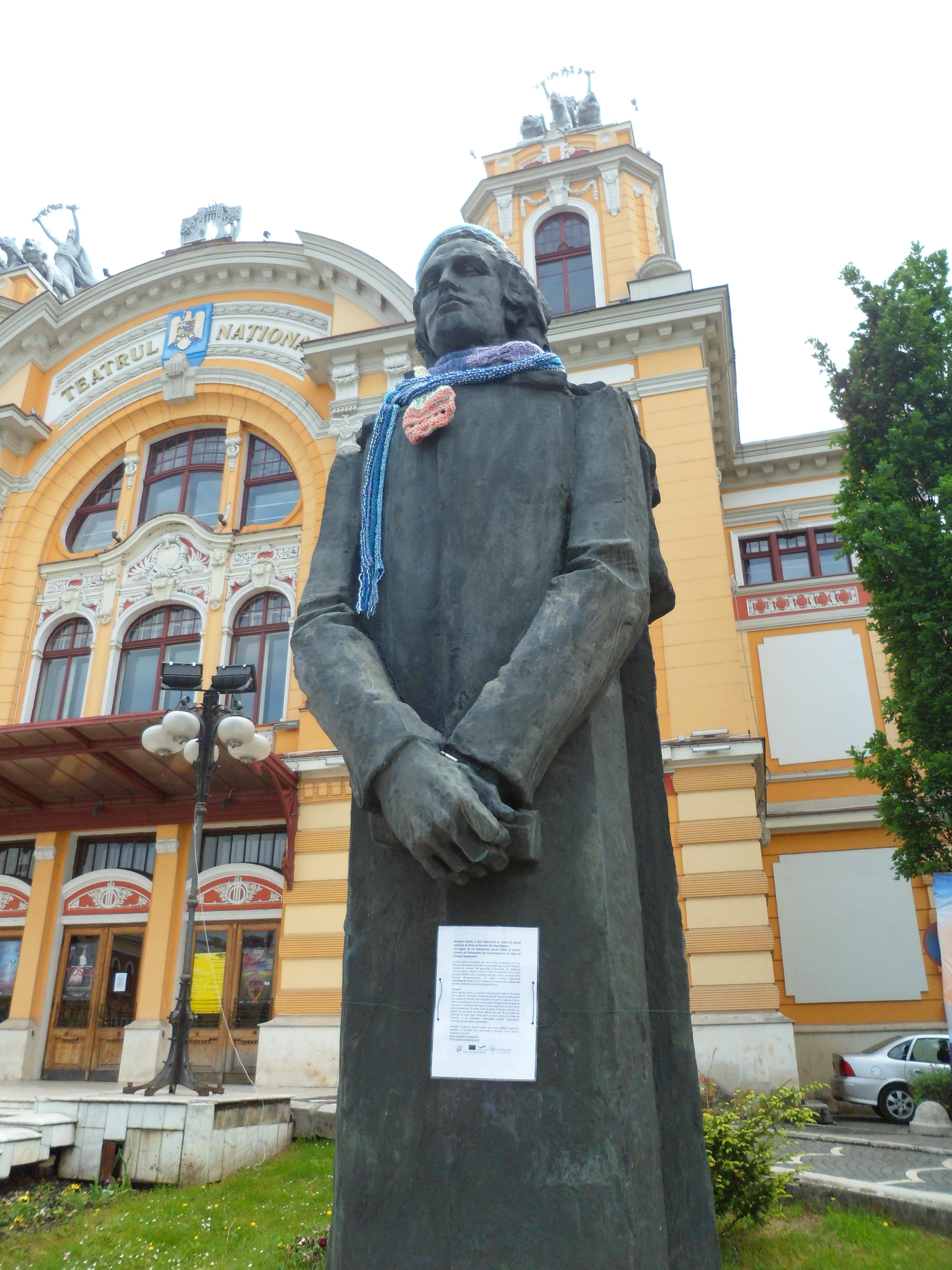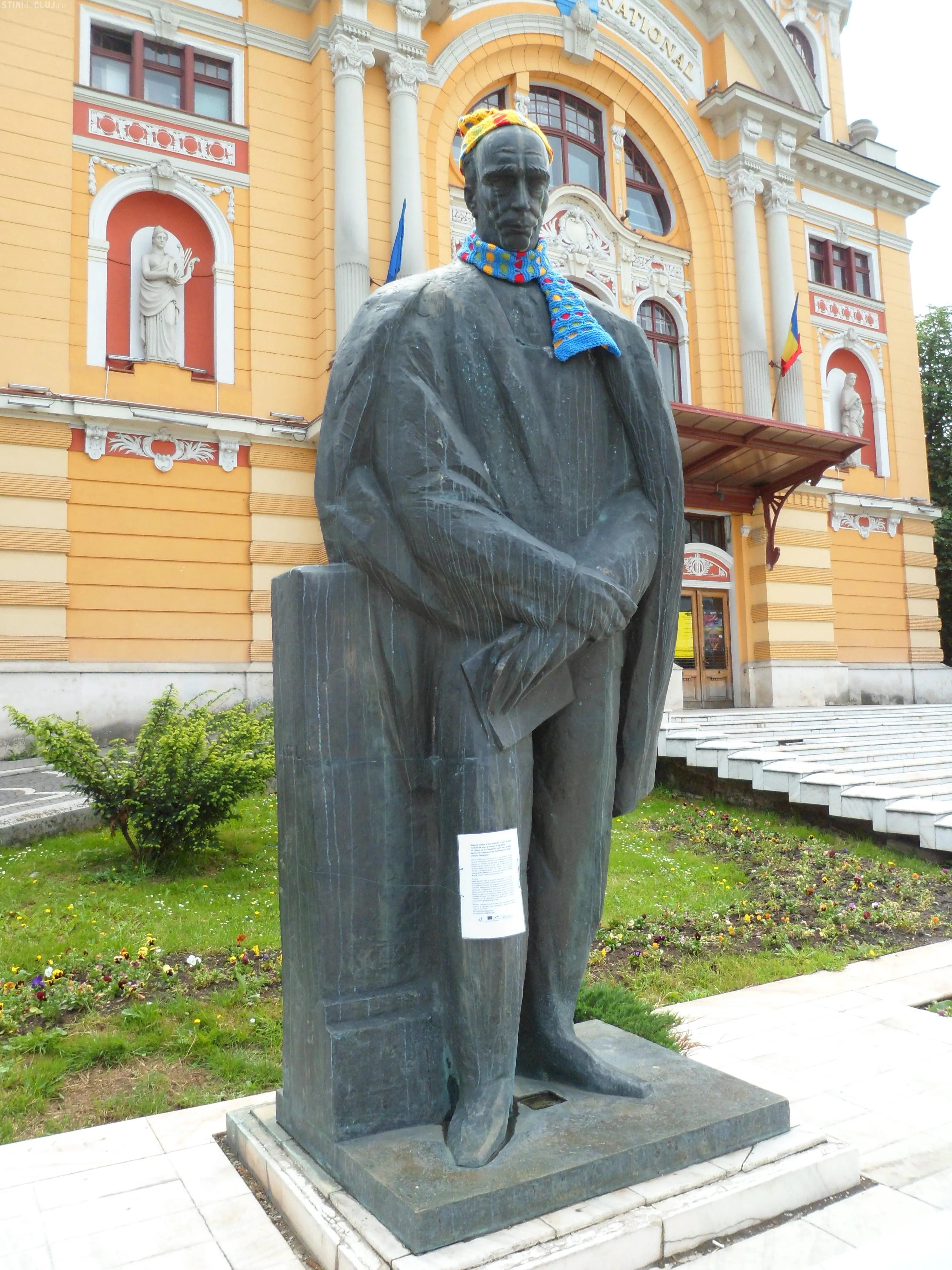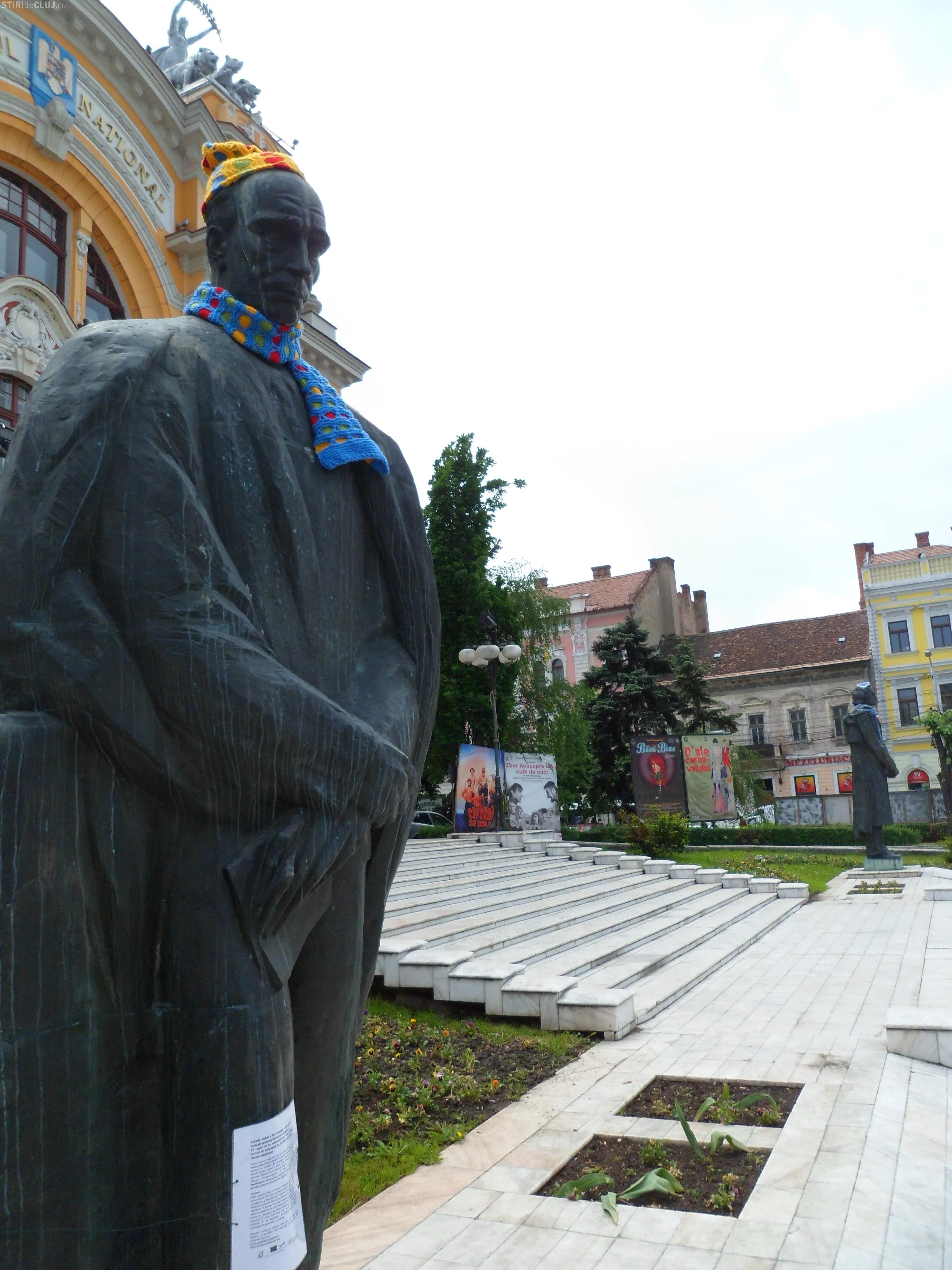 Statuile lui Mihai Eminescu si Lucin Blaga, din fata Teatrului National Cluj, au fost "impodobite" cu fulare si caciuli.