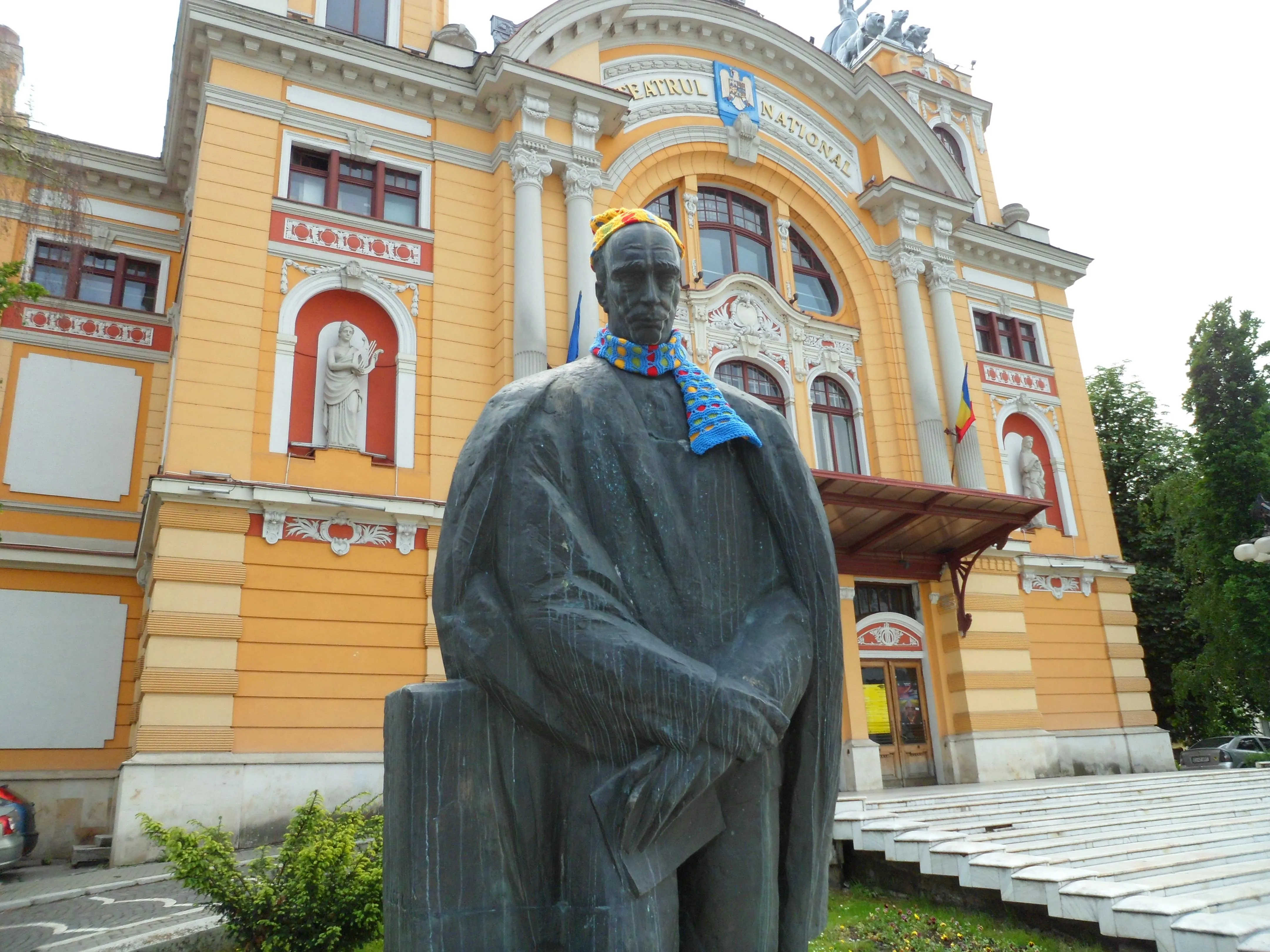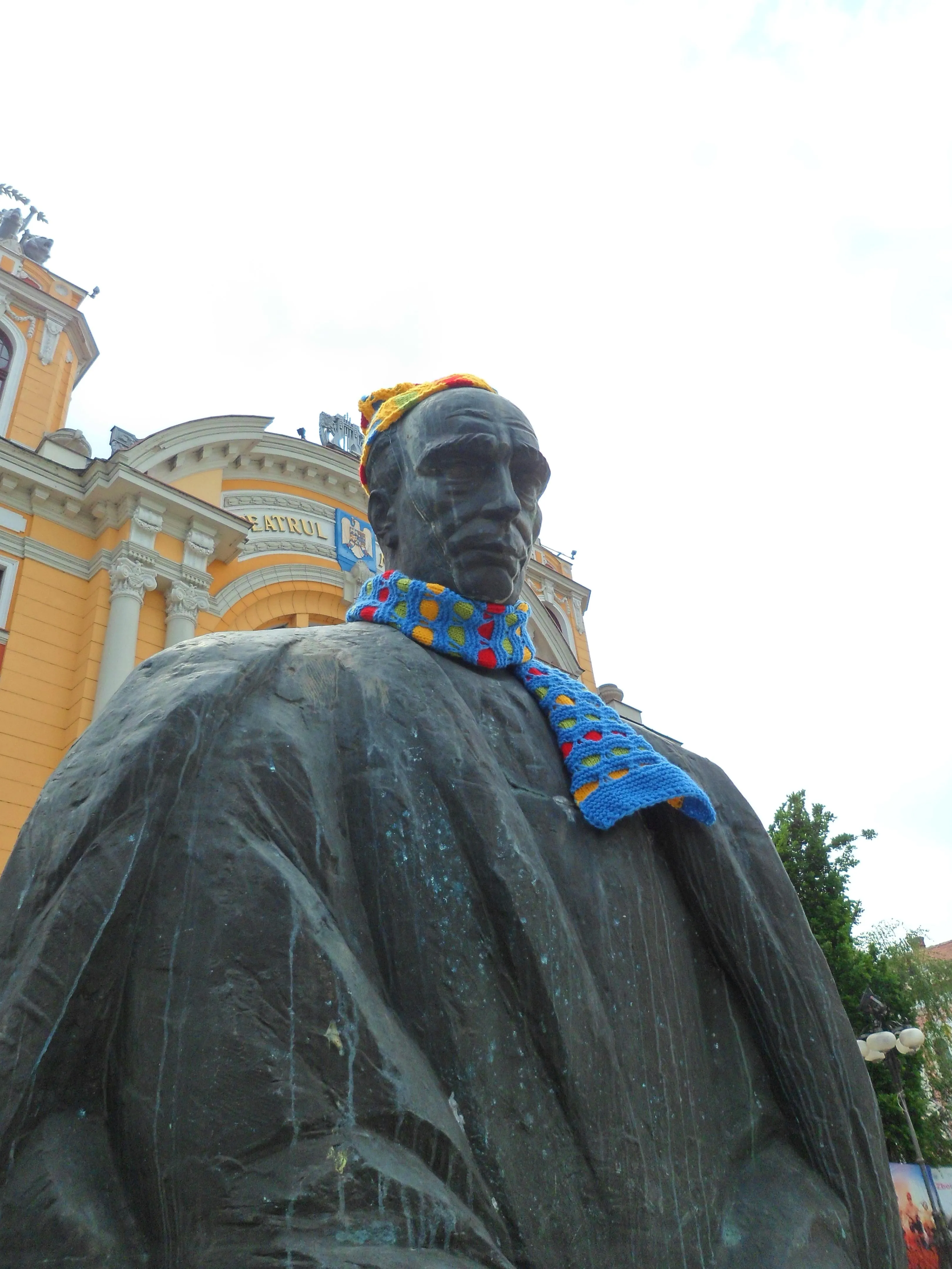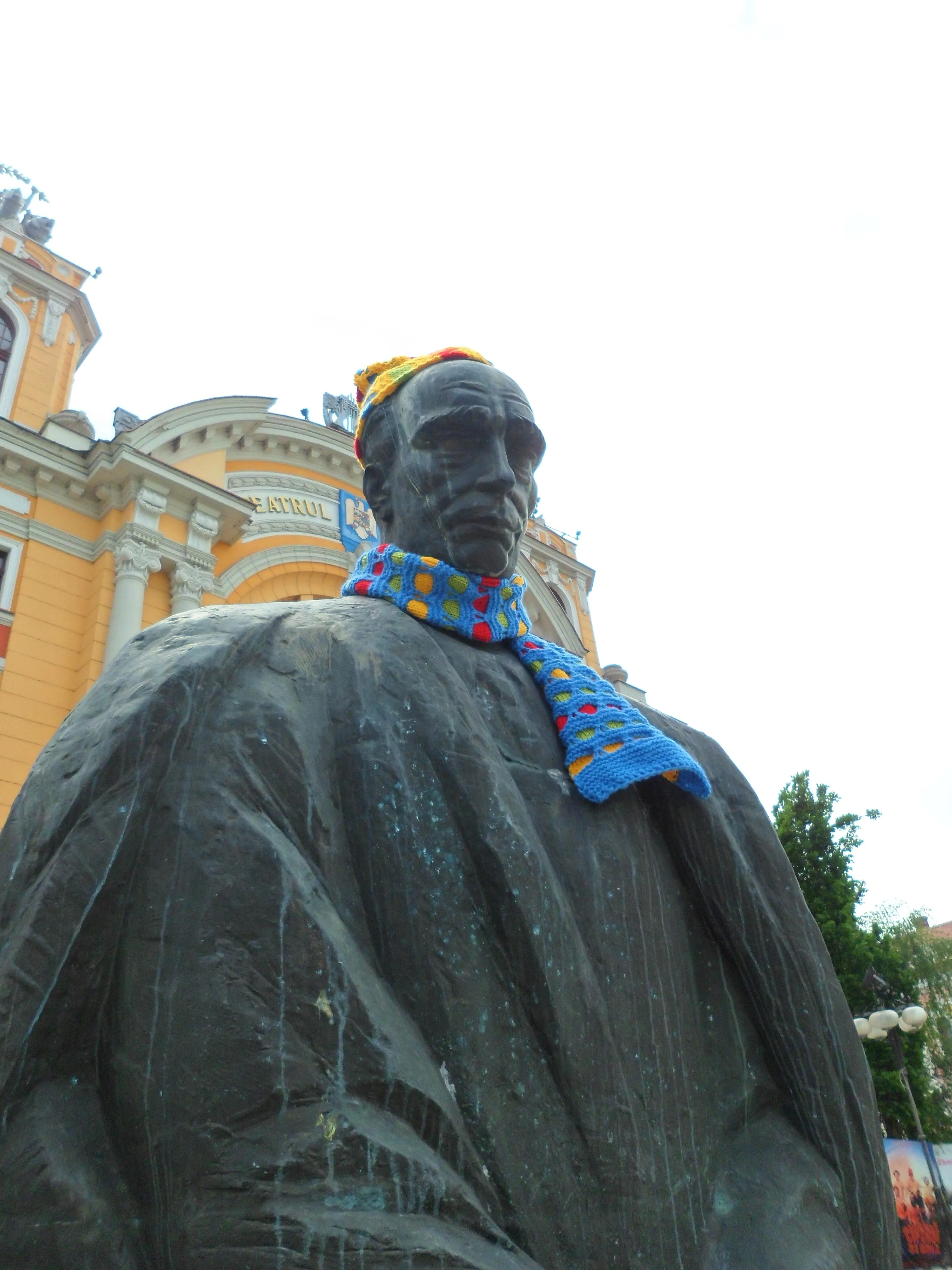 "Aceasta statuie a fost imbracata cu fulare si caciuli realizate de tineri si varstnici din Cluj-Napoca. Va rugam sa nu indepartati aceste fulare si caciuli, Centrul de Voluntariat le va ridica la sfarsitul saptamanii. Scopul acestui eveniment este de a arata locuitorilor din Cluj-Napoca diversitatea modurilor in care mestesugurile pot fi folosite. Acestea se transmit din generatie in generatie, iar realizarea tuturor acestor caciuli si fulare a fost o modalitate de a reuni generatii diferite intr-o activitate comuna si de a provoca astfel dialogul intergenerational", au scris voluntarii pe un afis lipit pe cele doua statui.