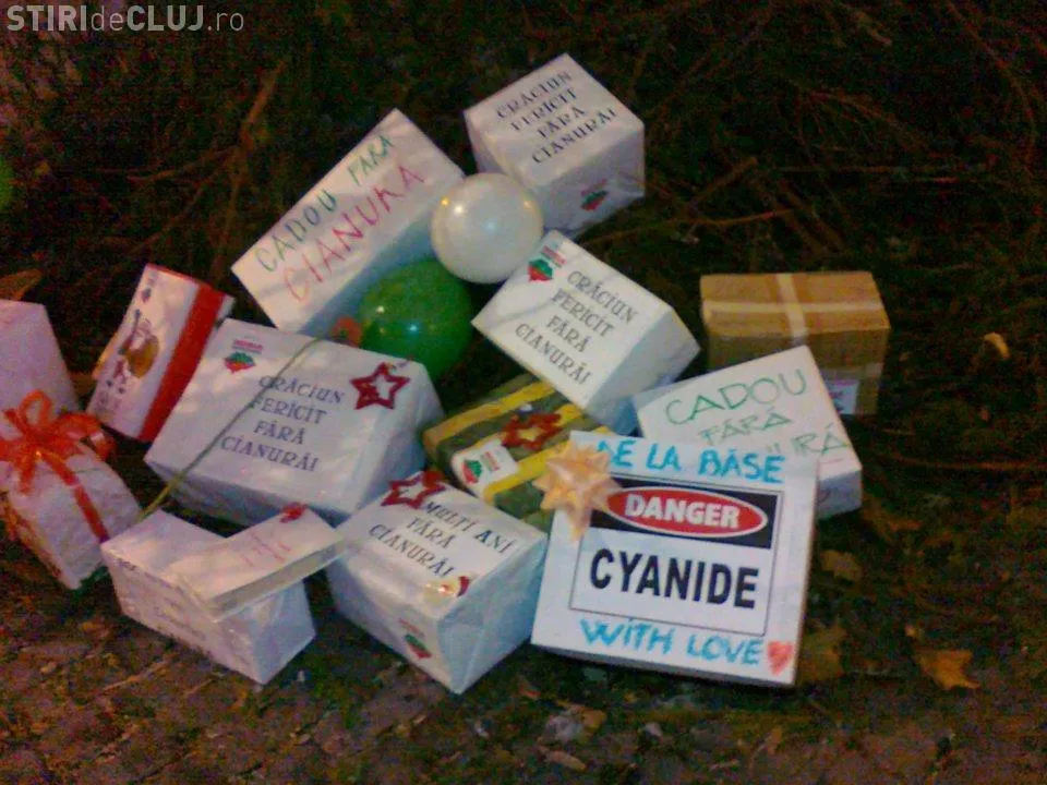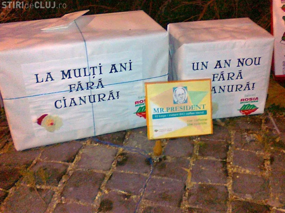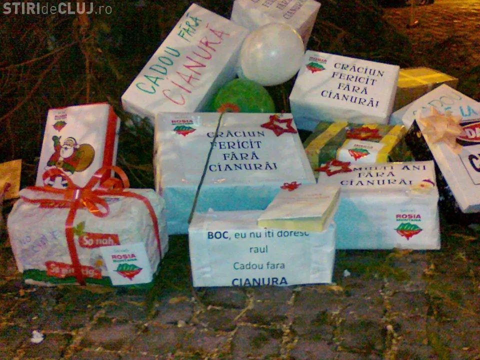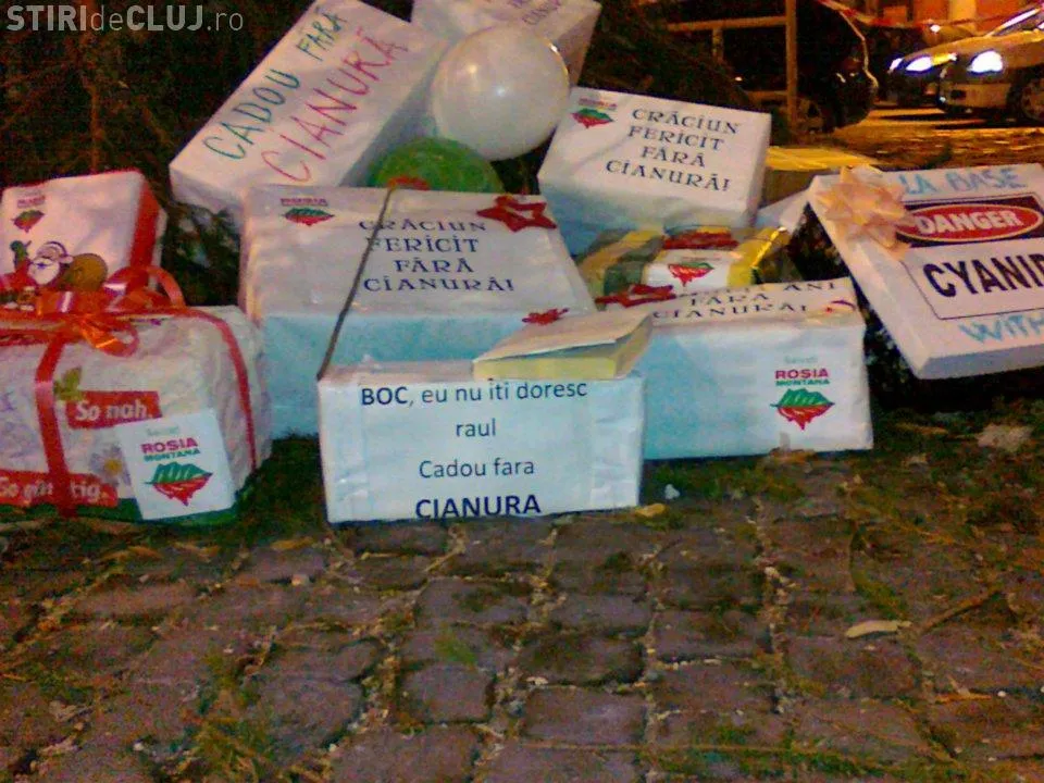 Activistii Rosia Montana au lasat cadouri fara cianuri pentru politicienii romani, sub bradul din Piata Unirii.