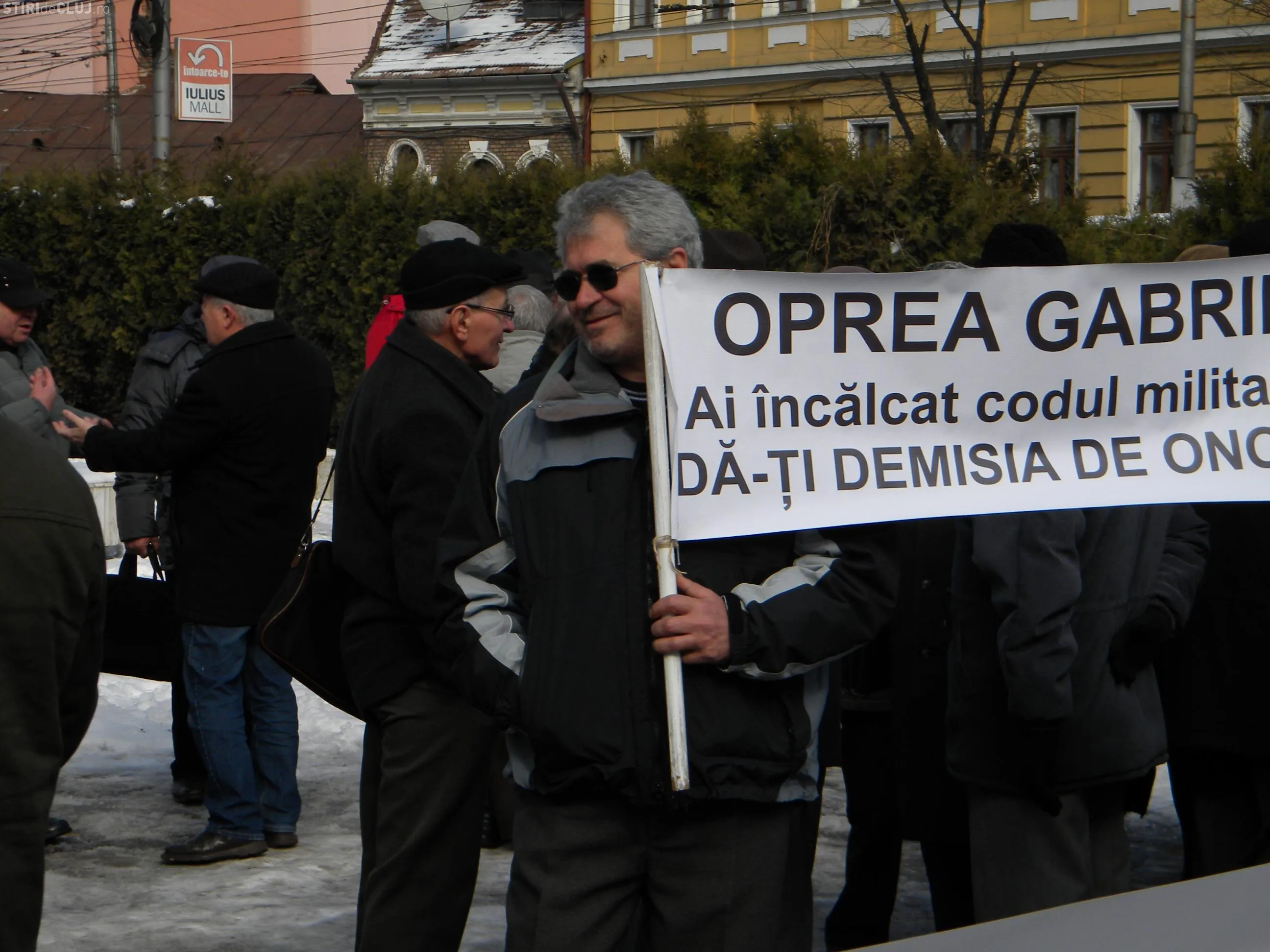 Peste 100 de militari in rezerva membri ai Sindicatului Cadrelor Militare Disponibilizate in Rezerva si Retragere (SCMDRR) Cluj protesteaza in fata Prefecturii Cluj fata de taiarea pensiilor si retragerea gradelor militare.