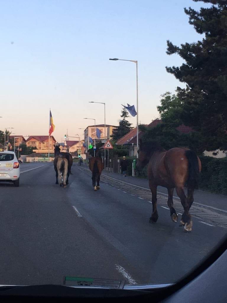 Un grup de cai au fost surprinși mergând pe strada, în Florești, sâmbătă dimineață.