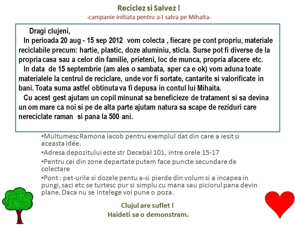 "Am vrut sa va mai scriu ceva sa fiu cu inima impacata : stiu ca atatia oameni au nevoie de ajutorul nostru si stiu ca lumea e receptiva mai mult la cancan si tragedii deja produse - eu vreau sa previn sa se intample una, nu vreau sa mai visez ci vreau sa pun umarul si la cazuri umanitare si la partea de reciclare. De asta am zis ca nu vad de ce sa nu va cer ajutorul sa promovam impreuna campania Reciclez si Salvez - pentru ca e un lucru bun..si cat de rare sunt in ziua de astazi !