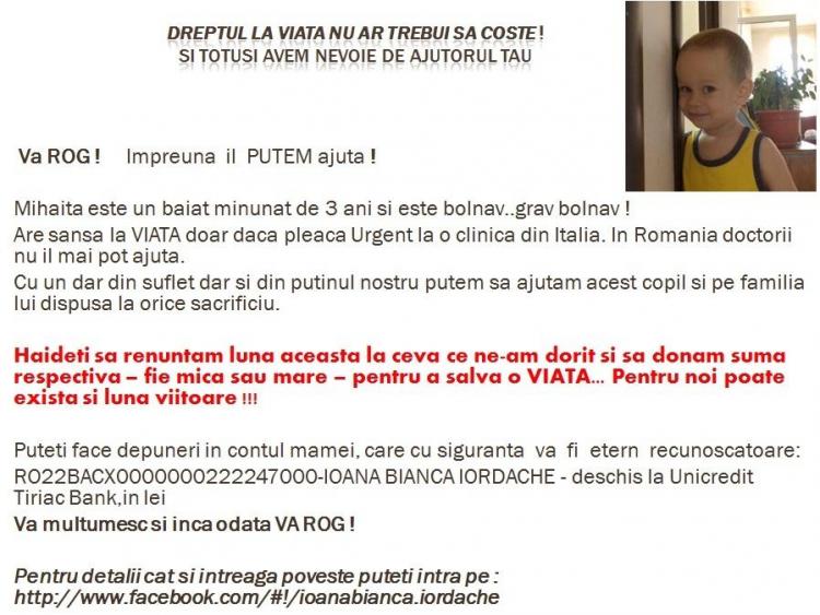 Campania a prins viaţă deoarece Mihăiţa, un băieţel în vârstă de doar 3 ani este grav bolnav, şi pentru asta trebuie tratat în Italia, deoarece în România medicii nu au cum să-l ajute.
