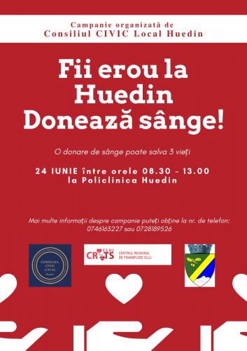 Consiliul Civic Huedin, împreună cu Primăria Huedin și Centru de Transfuzii Cluj, organizează campania de donare de sânge „Fii erou la Huedin! Donează sânge”.