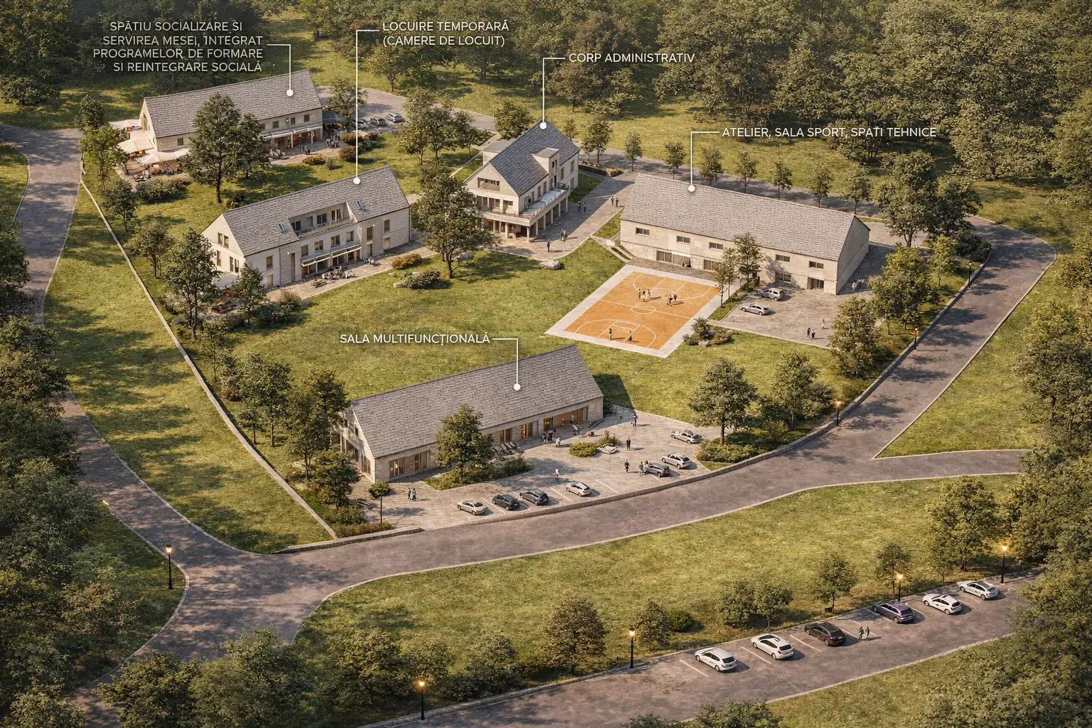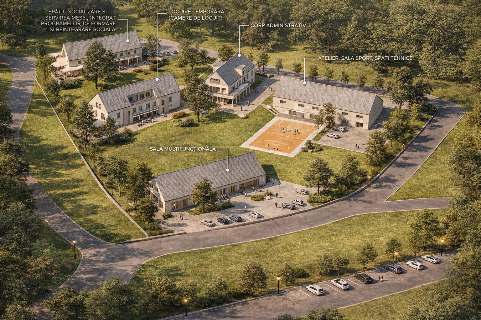 Potrivit documentației întocmite de o firmă de specialitate, proiectul prevede construirea unui ansamblu cu funcțiuni specifice procesului de reabilitare. Acesta va include camere de locuit temporar pentru beneficiari, spații administrative, o sală multifuncțională, atelier, sală și terenuri de sport, precum și zone de recreere. De asemenea, este prevăzut și un spațiu de alimentație publică de aproximativ 250 de metri pătrați, integrat în activitățile de formare profesională.