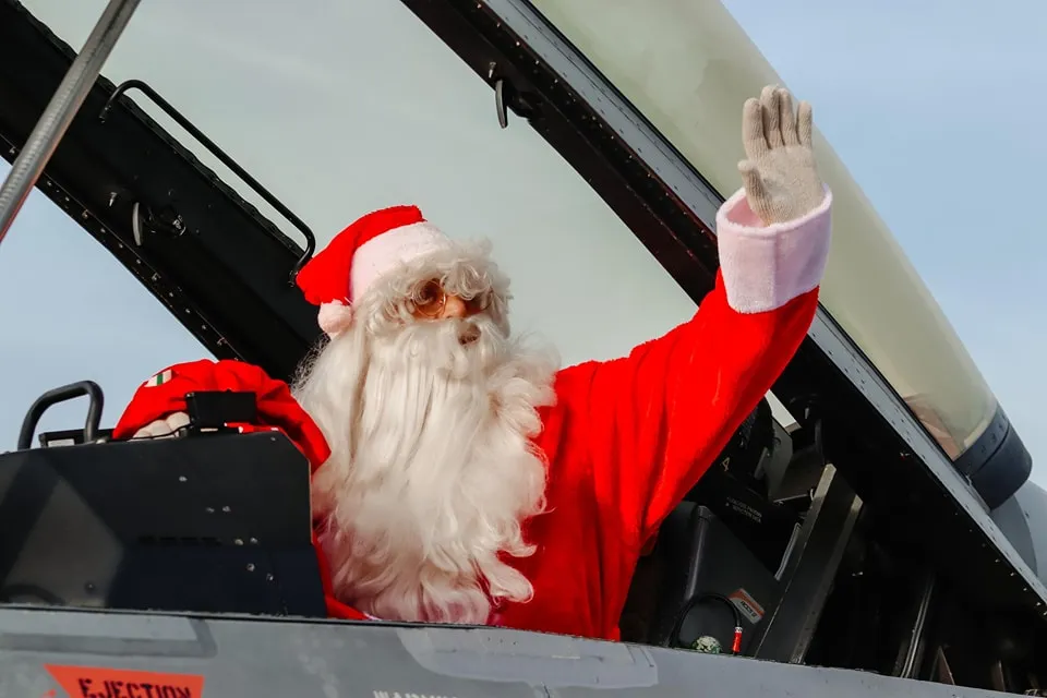Moș Crăciun a lăsat sania și renii la Polul Nord și a ales un mijloc de transport cu adevărat spectaculos: a sosit cu o aeronavă F-16.