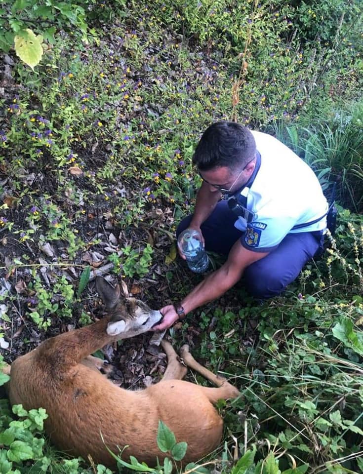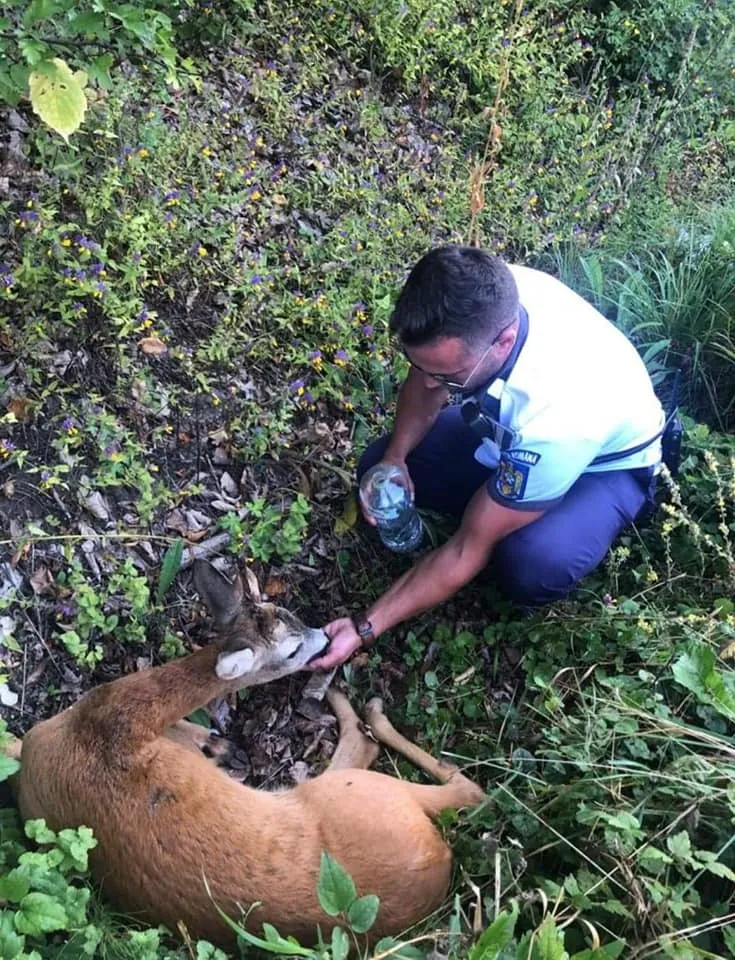 ”Polițiștii din cadrul biroului rutier , unul din ei a mai facut fapte de caritate de care ne aducem cu plăcere aminte, i-au oferit ajutor caprioarei lovite până la sosirea celor abilitați sa gestioneze situația când este implicat un animal sălbatic în incident rutier (conform procedurii). Căprioara și-a revenit și a fost dusă în zonă în care să nu fie în pericol.