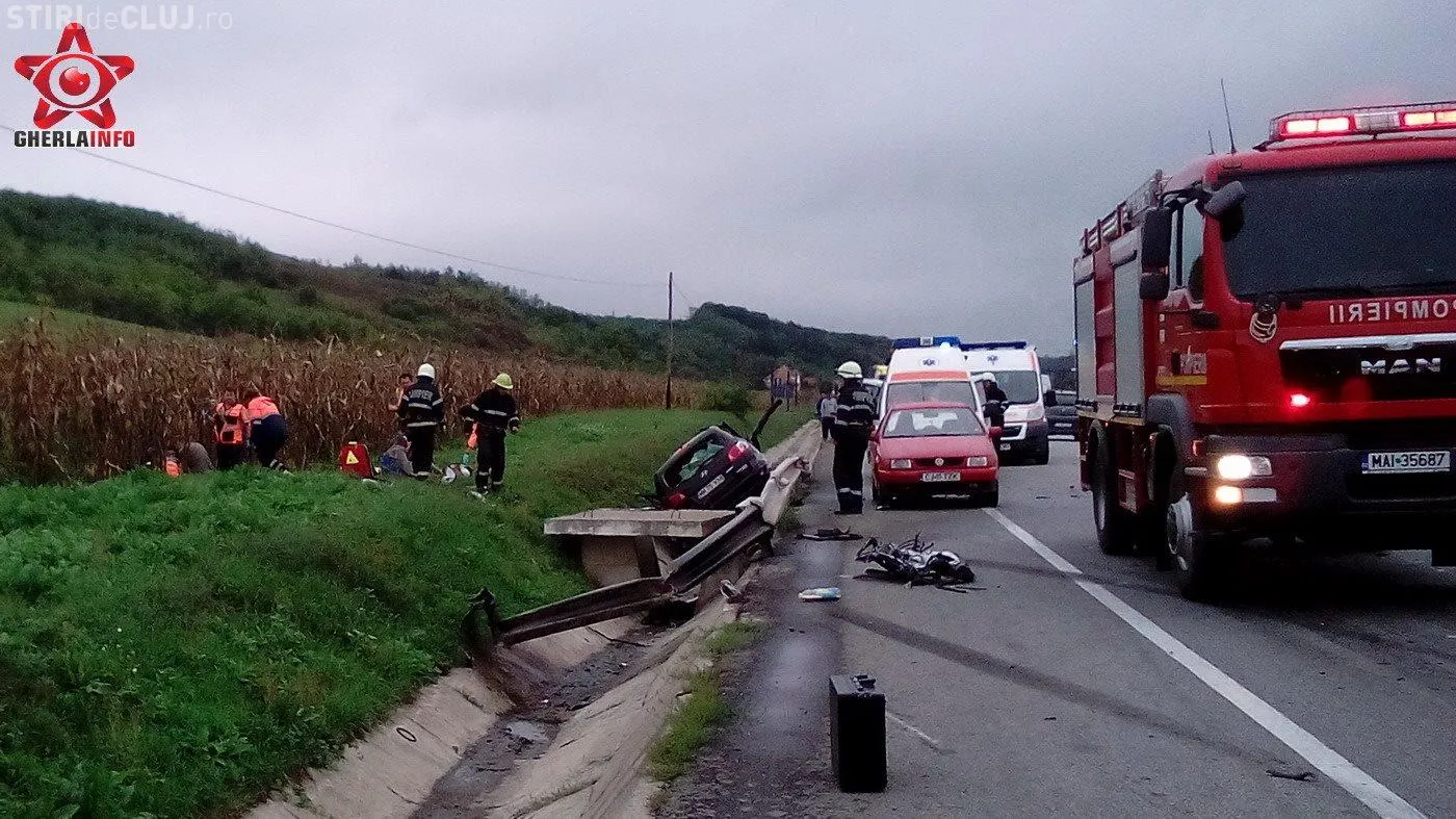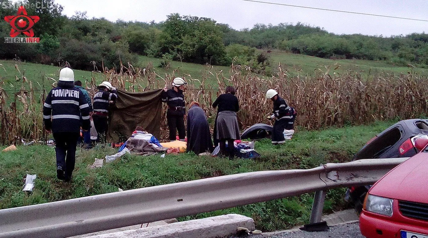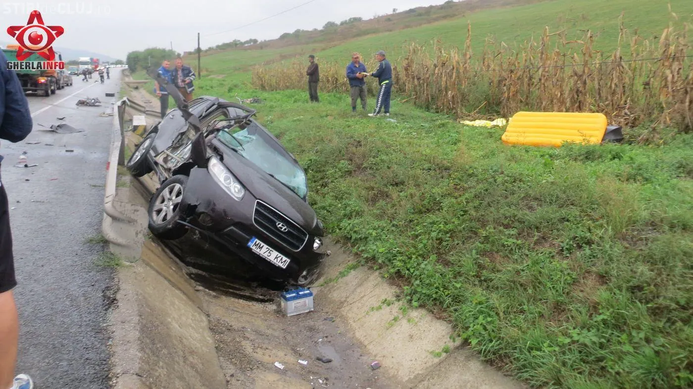 Autoturismul s-a izbit apoi de un parapet de pe marginea drumului si s-a rasturnat intr-un sant de beton. O fetita de 10 ani din masina de Maramures a fost proiectata prin geam pe un camp din apropiere. In masina se mai aflau inca doi copii, de 2 si 4 ani si o femeie, scrie Gherla Info.