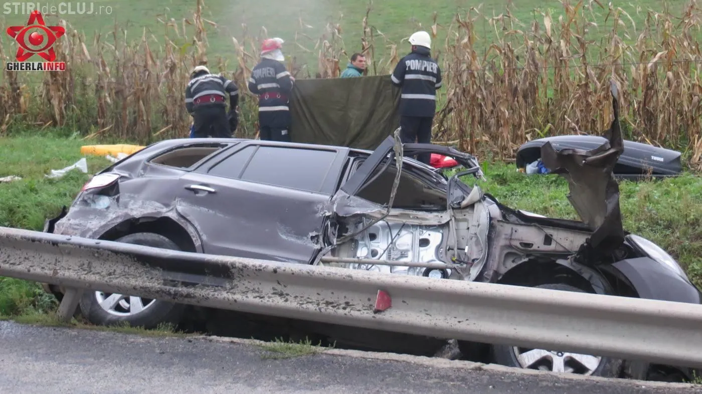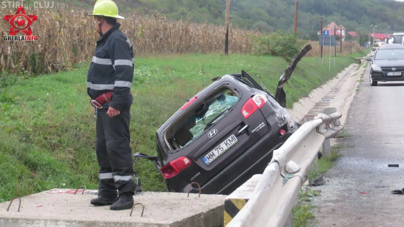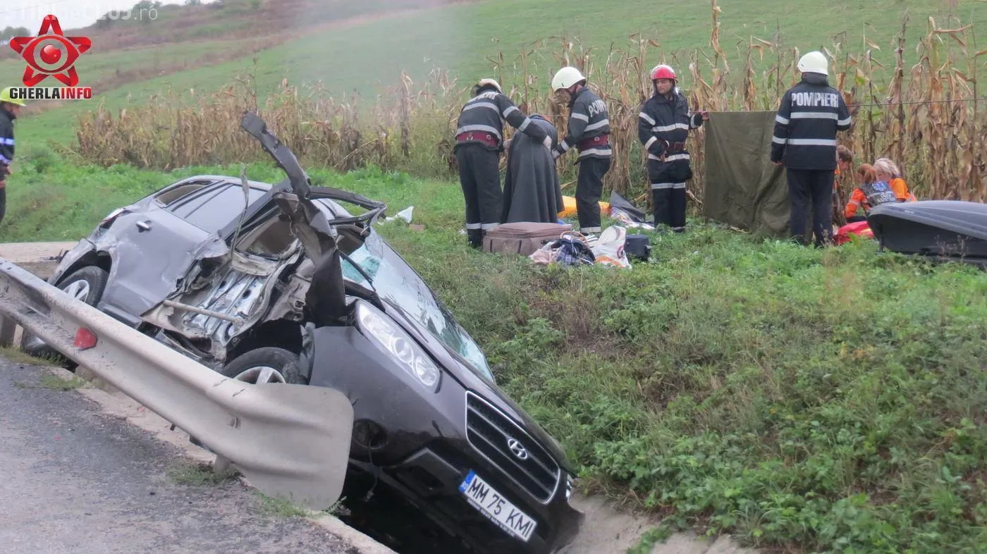Autoturismul s-a izbit apoi de un parapet de pe marginea drumului si s-a rasturnat intr-un sant de beton. O fetita de 10 ani din masina de Maramures a fost proiectata prin geam pe un camp din apropiere. In masina se mai aflau inca doi copii, de 2 si 4 ani si o femeie, scrie Gherla Info.