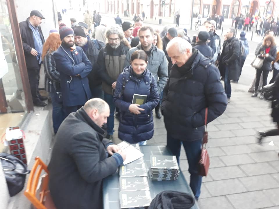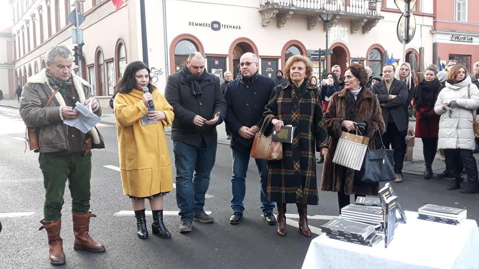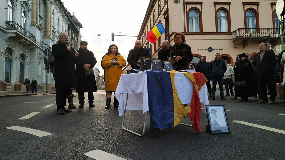 Circulația a fost blocată, iar în mijlocul intersecției de lângă Conti și librăria Universității a fost pusă o măsuță acoperită cu tricolorul găurit, pe care au fot așezate cărțile despre viața lui Călin Nemeș.