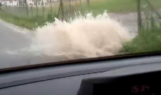 Din imaginile surprinse de un clujean se vede cum rigolele de pe marginea drumului nu au mai făcut față și șoseaua a fost inundată.