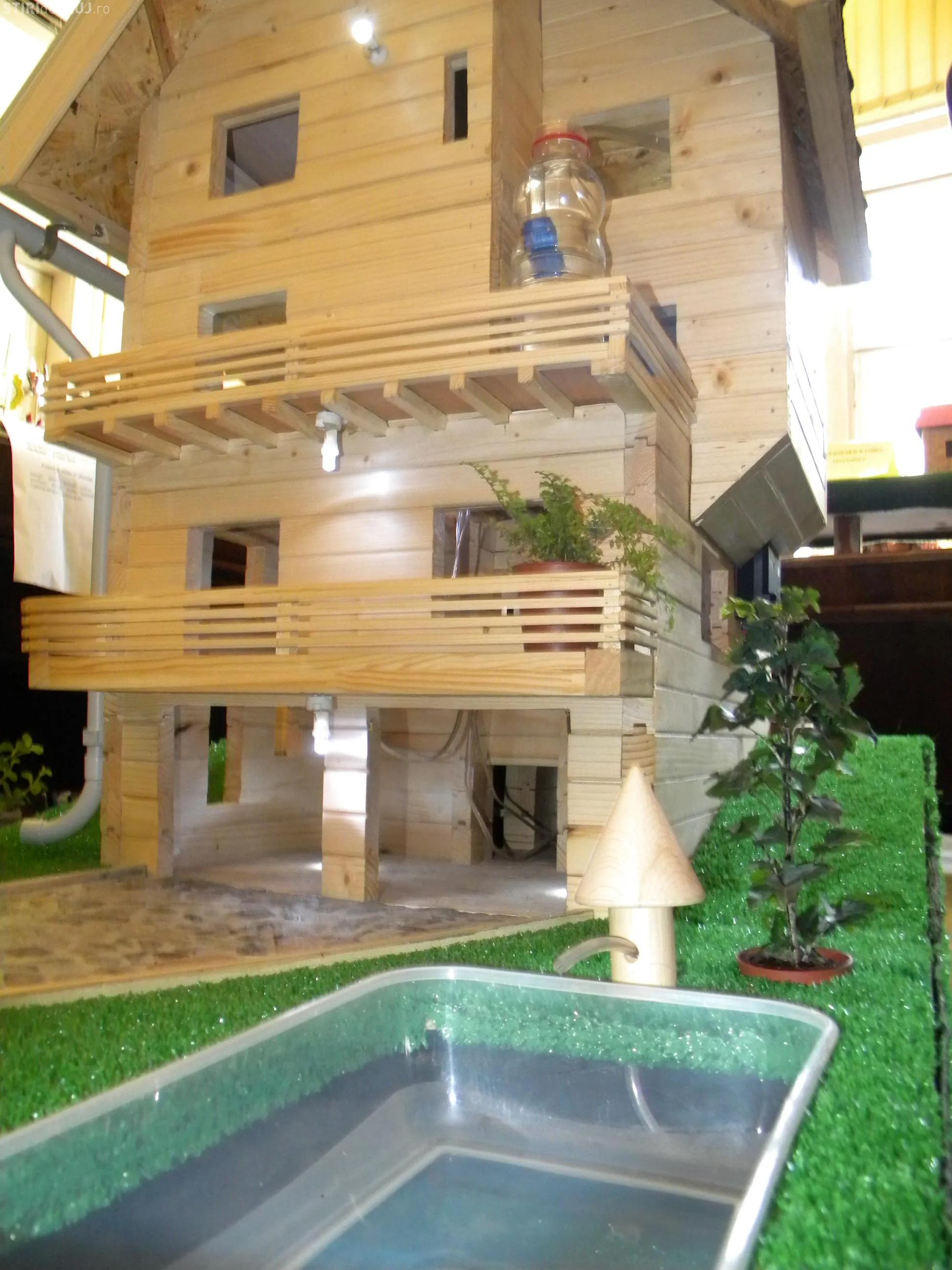 "Am venit cu casa ecologica care functioneaza strict independent din punct de vedere electric. Avem un panou fotovoltaic pentru curent electric. Pentru apa menajera putem folosi colectarea apei pluviale, care se aduna intr-un bazin subteran pentru a nu se evapora. Colectarea deseurilor se face in mod selectiv: plastic, hartie si compost, care se poate folosi mai departe in gradina ca si ingrasamant. Pentru incalzire folosim un sistem mai nou, sistemul de gheata", a explicat Matei Bobis, elev in clasa a X-a.