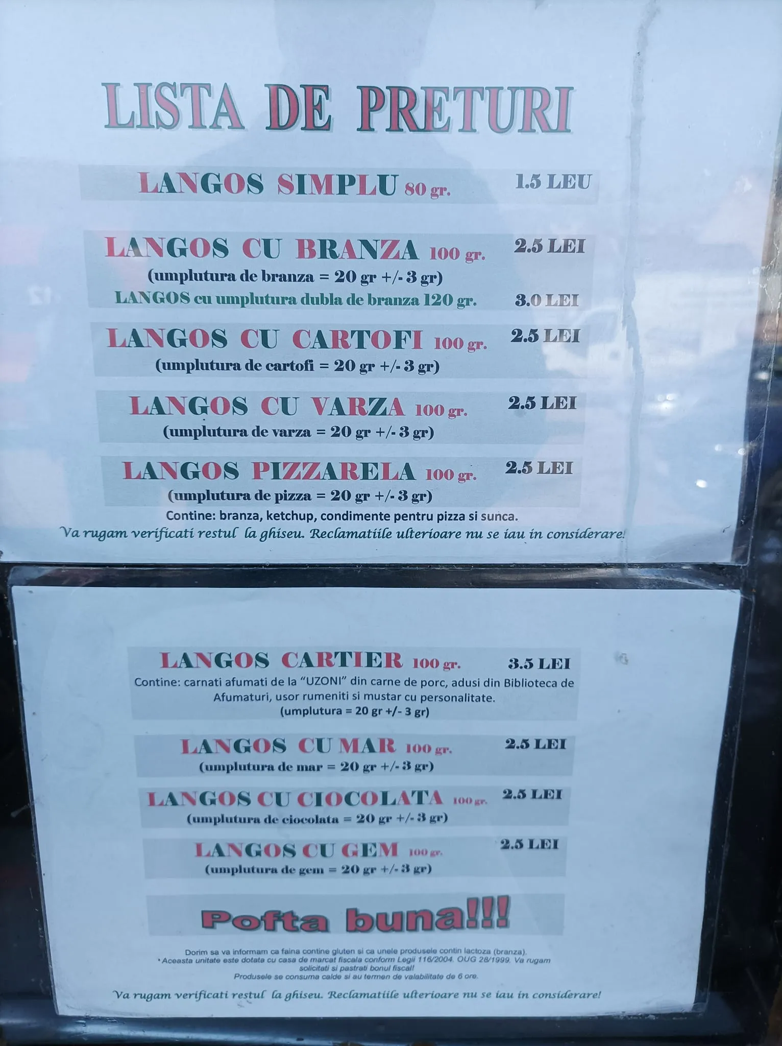 La Cluj-napoca, la punctul din Parcul Central, de pe Aleea Stadion, un langoș cu smântână și usturoi, deci simplu, costă 20 de lei. La Târgul de Crăciun din decembrie 2022, prețurile la langoș au început de la 20 de lei.