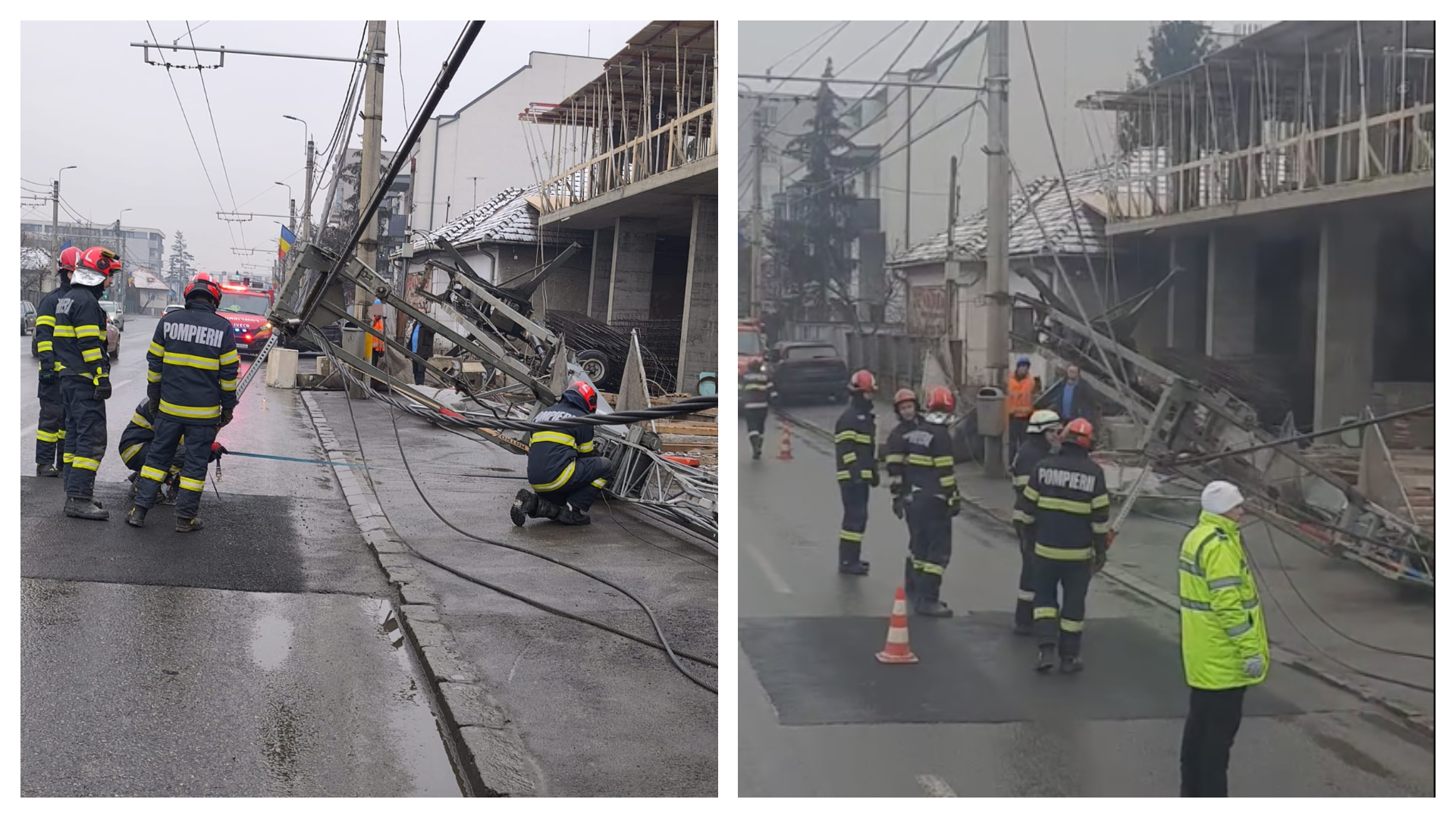 „Pompierii din cadrul Detașamentului 1 Cluj-Napoca intervin în aceste momente pe strada Traian Vuia din Cluj-Napoca, unde o macara a căzut peste firele de curent.