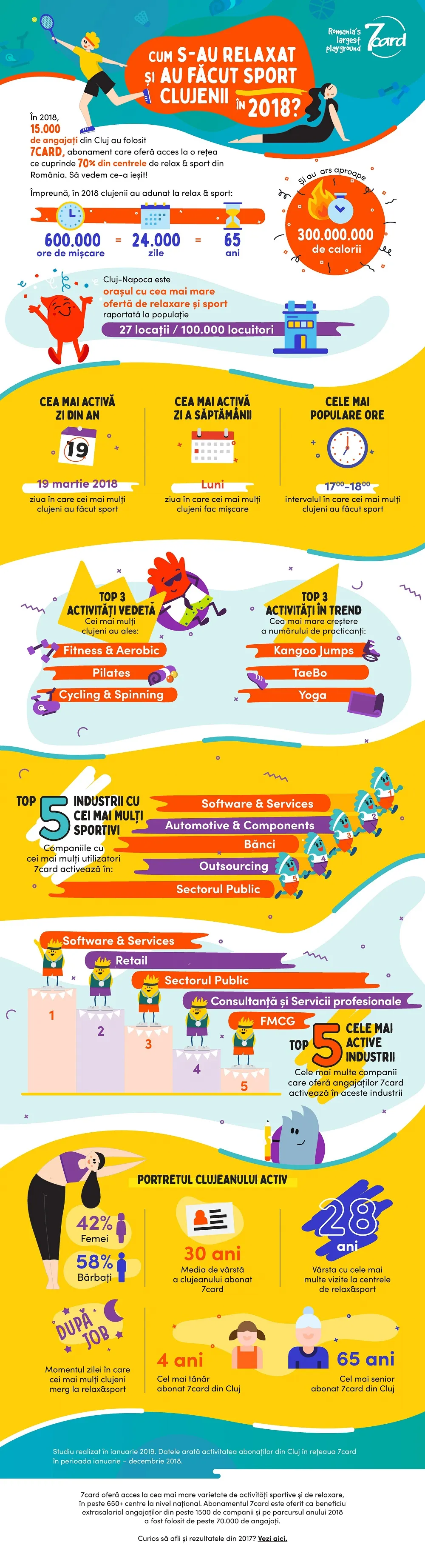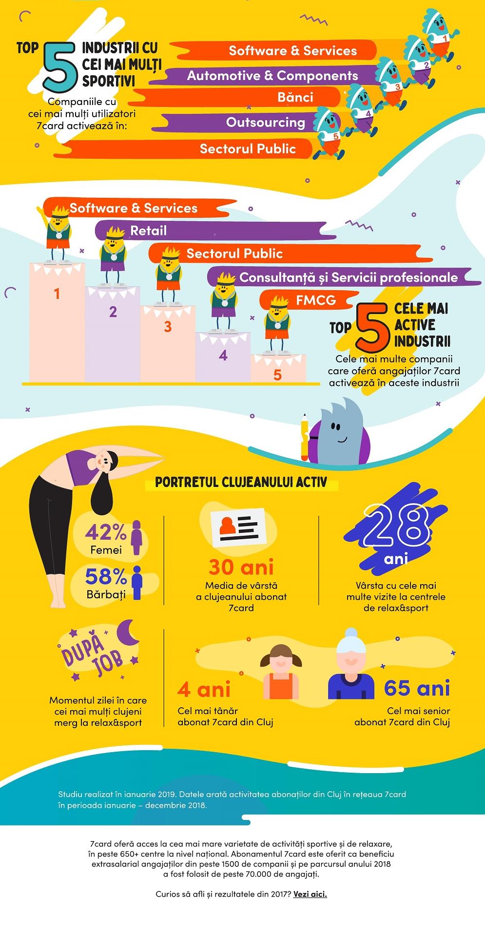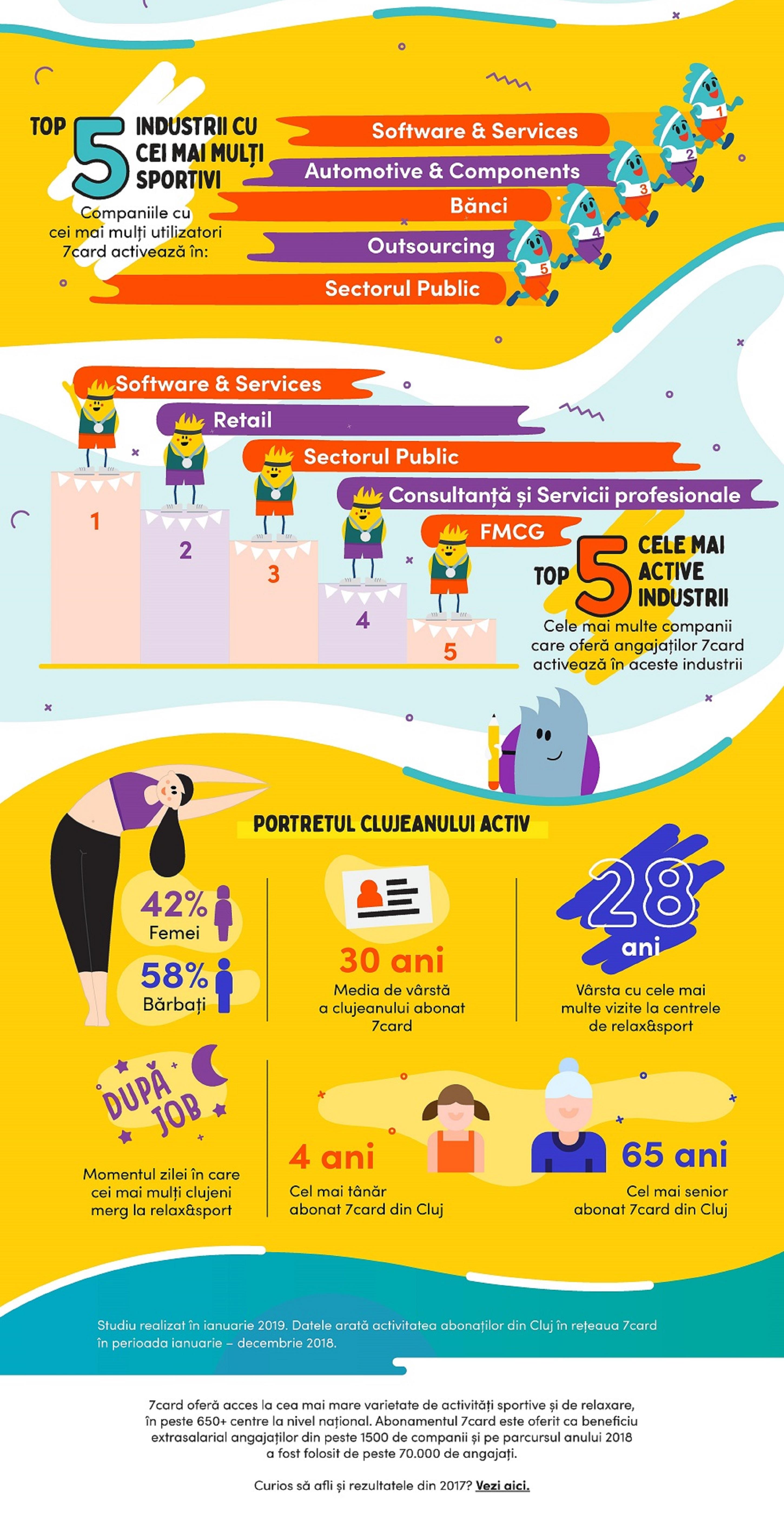 În ceea ce privește ”portretul” angajatului sportiv clujean, studiul arată că un procent de 42% dintre abonații 7card sunt femei, în timp ce restul de 58% sunt bărbați. Vârsta medie a abonaților clujeni este de 30 de ani, iar marea majoritate a acestora preferă să desfășoare activități sportive sau de relaxare după ce ies de la serviciu, intervalul orar în care abonații sunt cei mai activi fiind 17.00 - 18.00.De asemenea, ziua în care aceștia sunt cei mai activi este lunea.