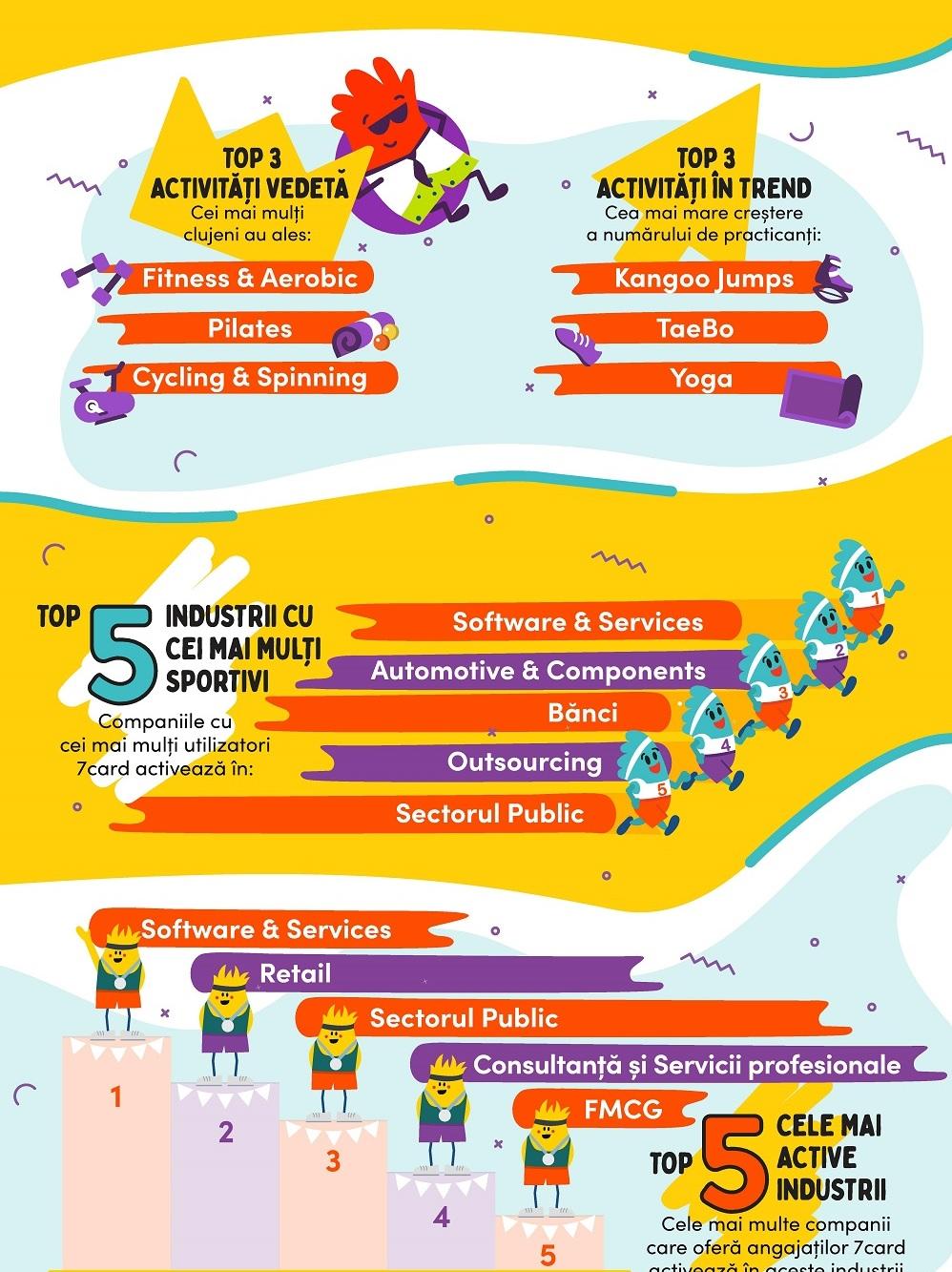Companiile cu cei mai ”sportivi” angajați (companiile cu cei mai mulți abonați 7card) din Cluj sunt din domeniile: Software & Services, Automotive & Components, bănci, outsourcing și din sectorul public.