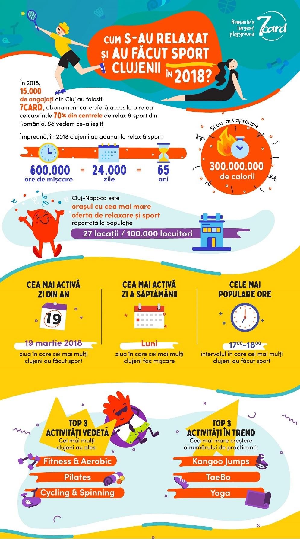 Astfel, în decursul anului 2018, abonații clujeni au însumat în total, 600.000 de ore de mișcare, care înseamnă 24.000 de zile sau 65 de ani. De asemenea, aceștia au reușit să ardă un total combinat de peste 300.000.000 de calorii.