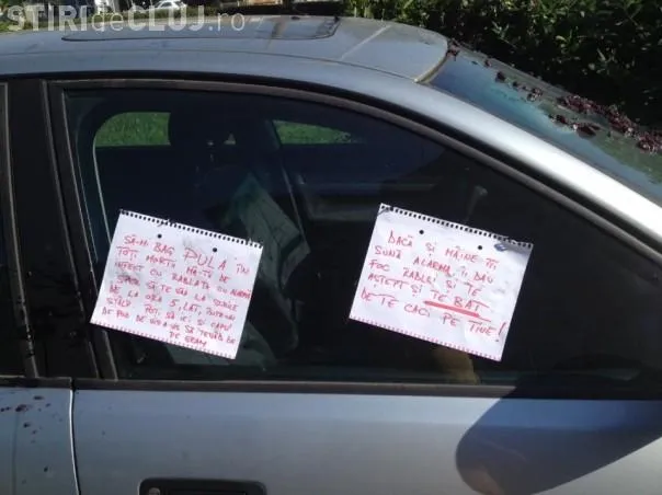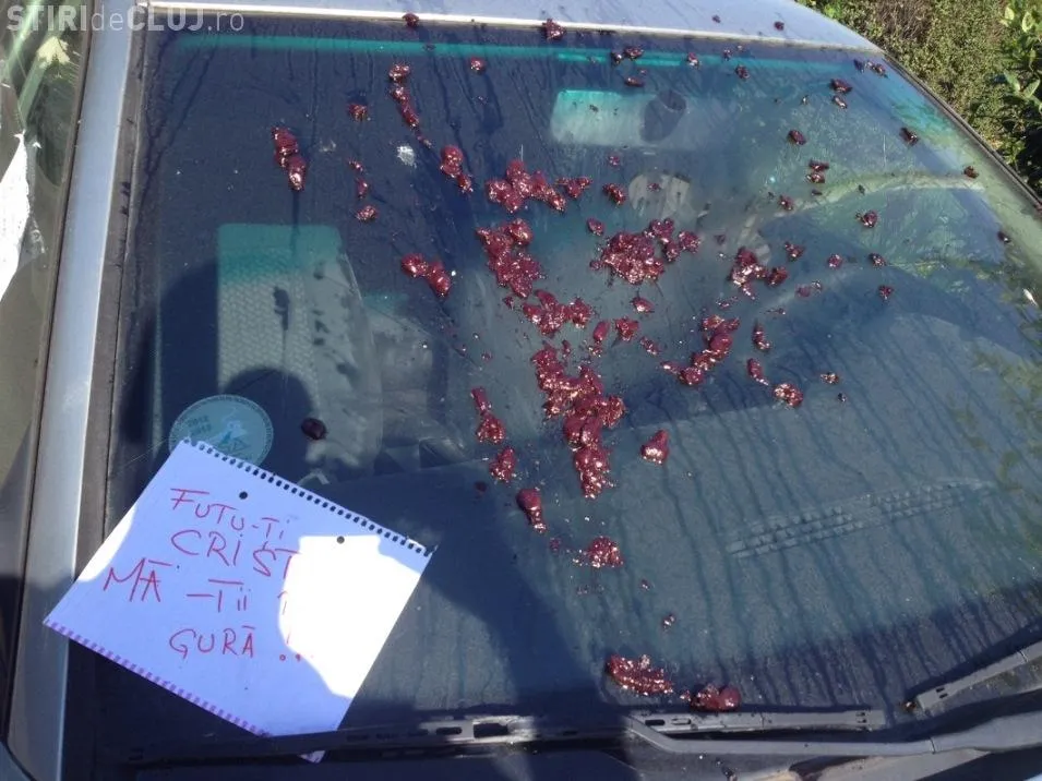 Mașina a fost fotografiată vineri dimineață, în Piața Abator, având parbrizul mânjit cu un ”cadou”. Pe geamuri au fost lipite câteva foi, în care clujeanul i-a urat șoferului ”toate cele bune”.