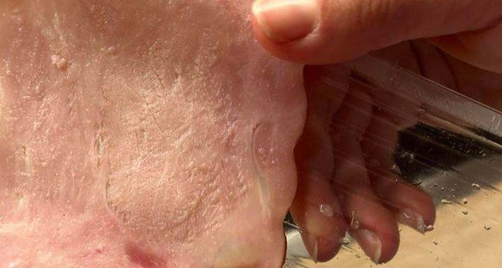 Aceasta a luat câteva felii de șuncă, produs sigilat, dar când a ajuns acasă și a deschis punga a avut parte de șocul vieții. În câteva bucăți erau niște fâșii de plastic.