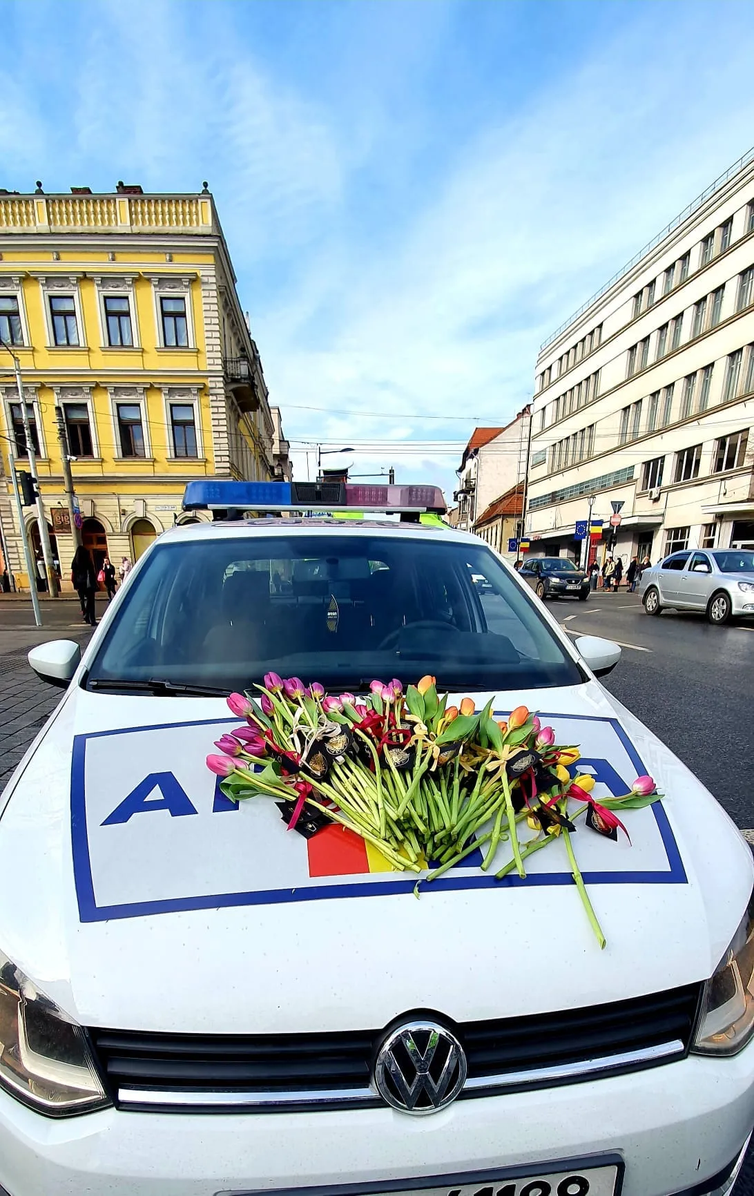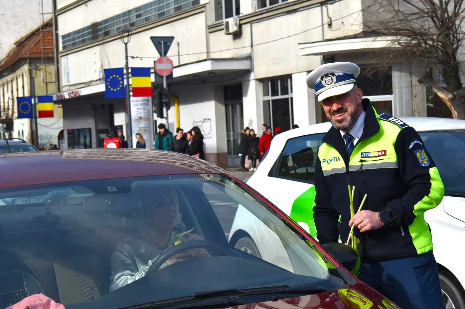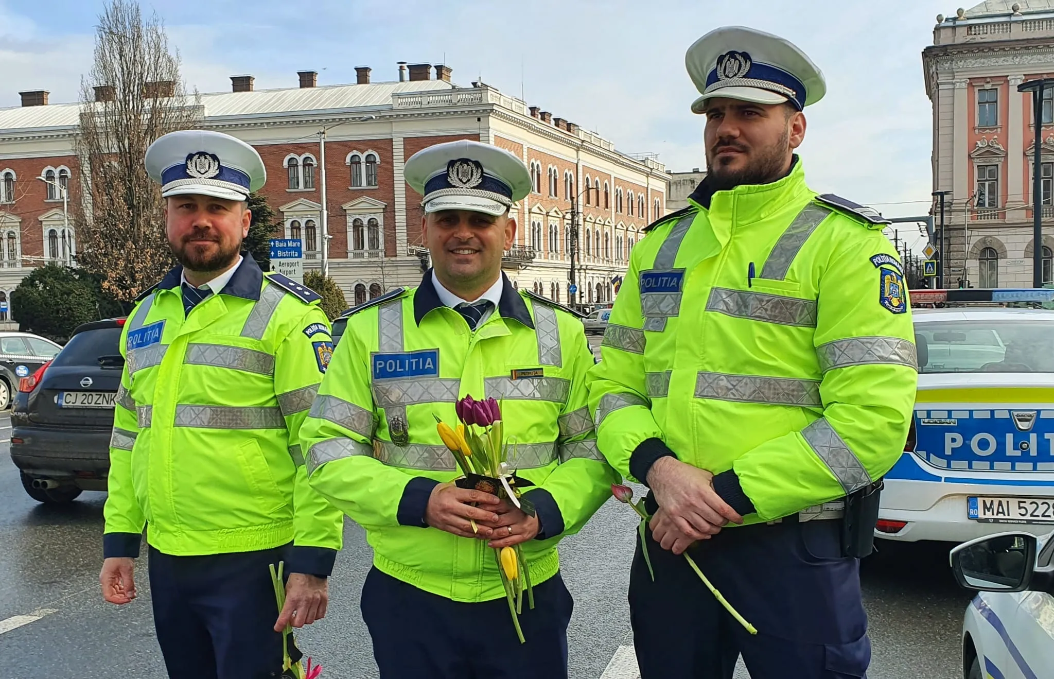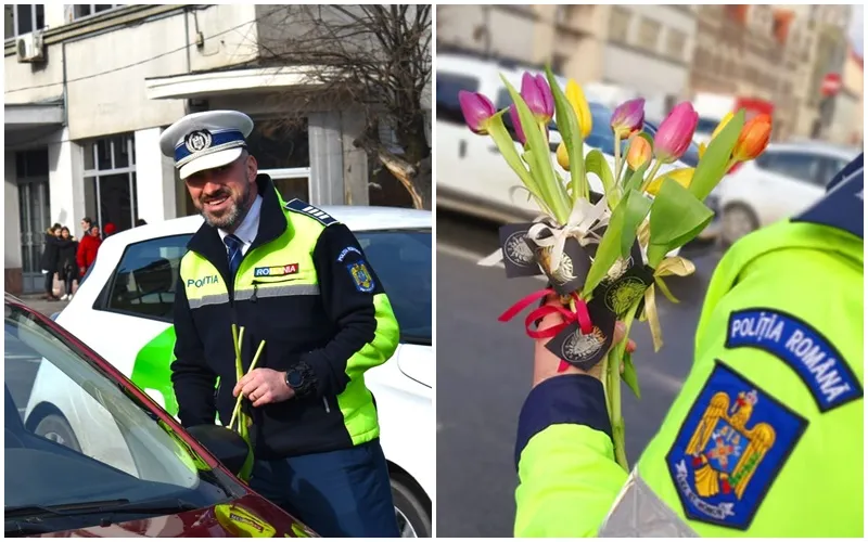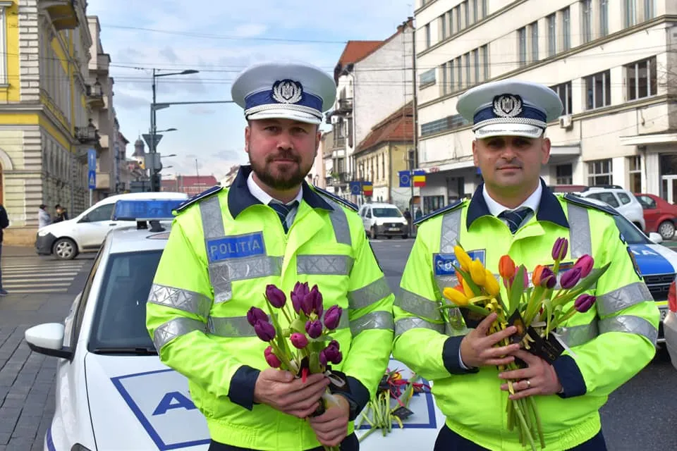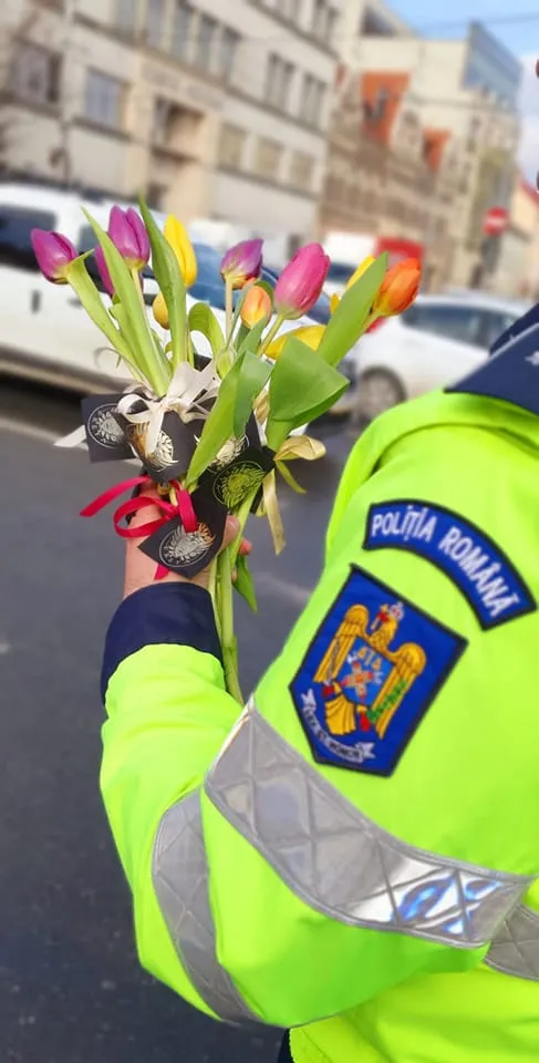 Polițiștii clujeni au împărțit lalele de Ziua Femeii șoferițelor oprite în trafic.