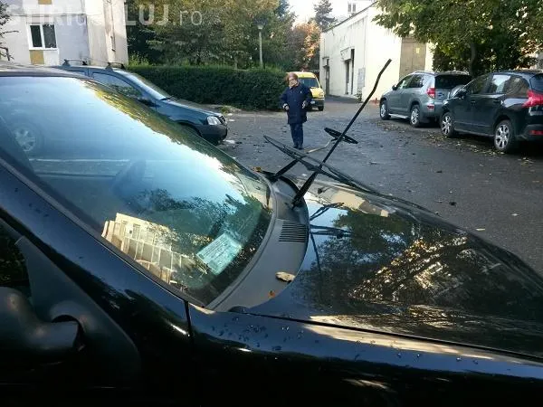 Un șofer s-a trezit cu mașina lovită și cu ștergătoarele rupte, în cartierul Gheorgheni, după ce a lăsat-o parcată chiar în intersecția unor alei.