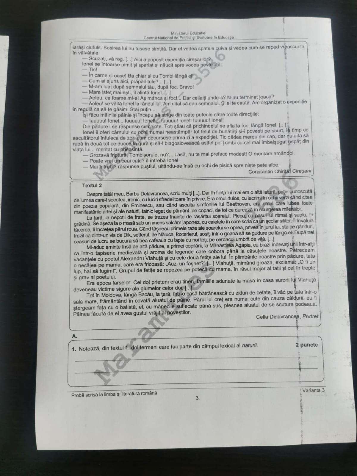 Din primele informații aflate de la elevii care au ieșit primii din salile de examen, se pare că la Evaluarea Națională 2024 la Limba română candidații au primit la subiectul II caracterizare de personaj din romanul „Cireșarii”, de Constantin Chiriță.